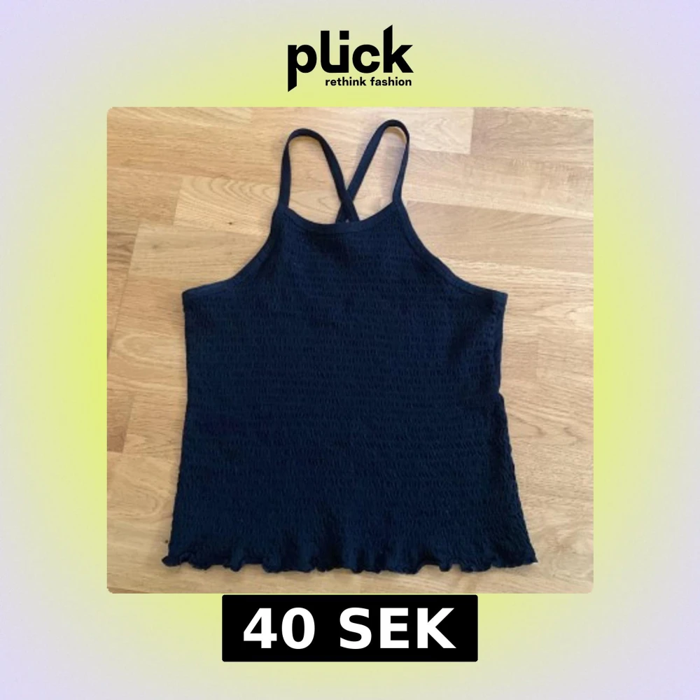 Svart linnetopp från Lindex med smockad struktur och tunna axelband som korsas i ryggen. Toppen har en lätt vågig kant nedtill och är ärmlös och stretchig. Du står för frakten, vid mer info skriv