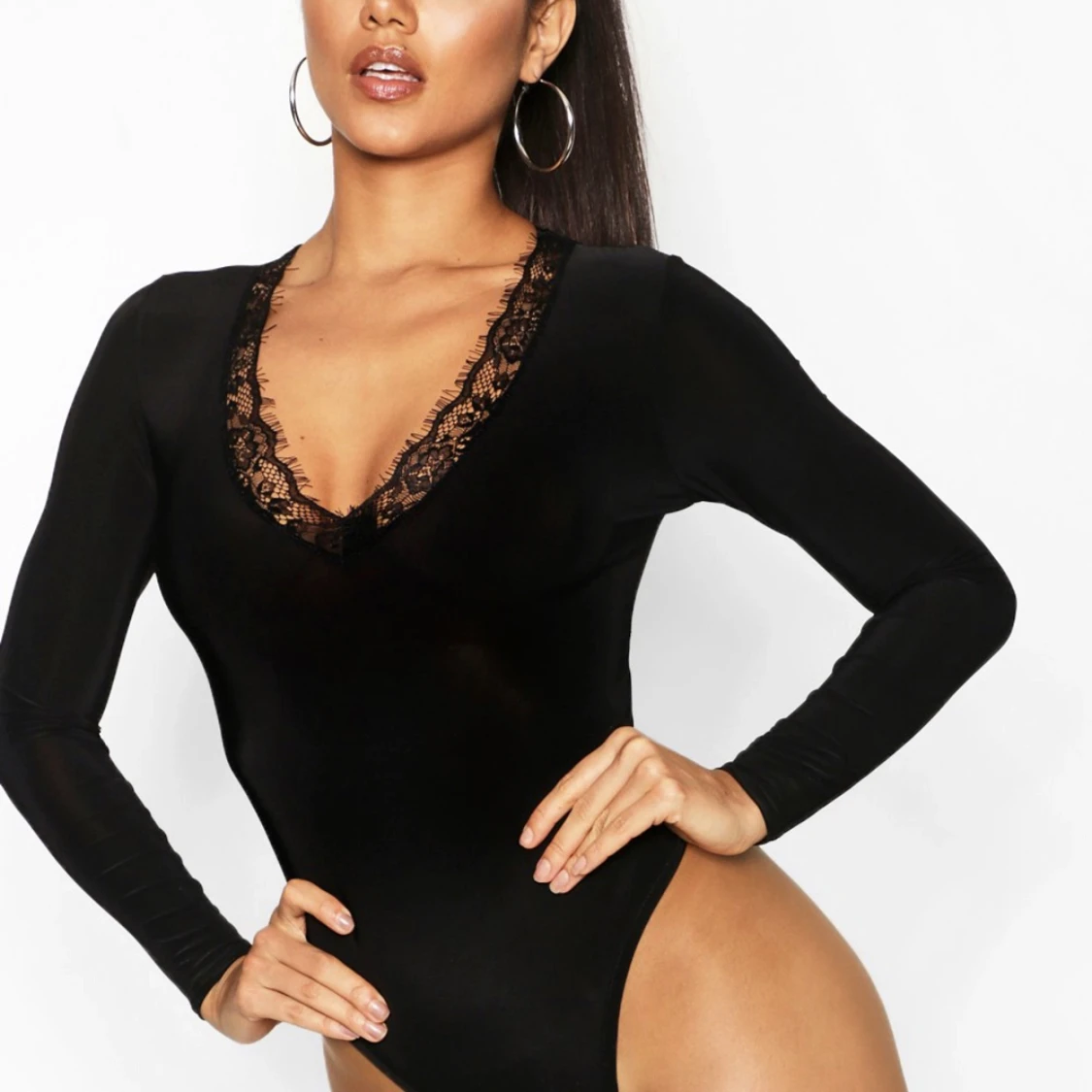 En svart Body med v-ringning och spetsdetalj från boohoo. Stretchig och jätte skön material. Oanvänd med prislappar på. Ordpris.217kr
