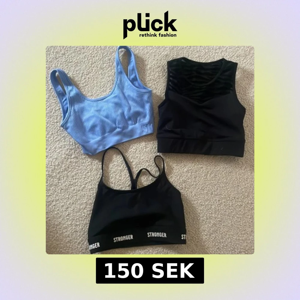 Säljer tre sportiga toppar från Stronger. En ljusblå ribbad topp med breda axelband, en svart topp med ett diskret mönster och en svart topp med smala axelband och logga vid nederkanten. Perfekta för träning eller en aktiv dag. M och s.