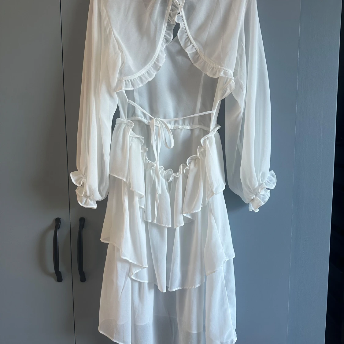 Fin vit klänning från NA-KD strl 36. Kanske di. studentklänning? Jättesöta volangdetaljer. Klänningen har långa ärmar och en öppen rygg med knytband. Jättefint skick! Se gärna mina övriga annonser för fler sommarkläder!