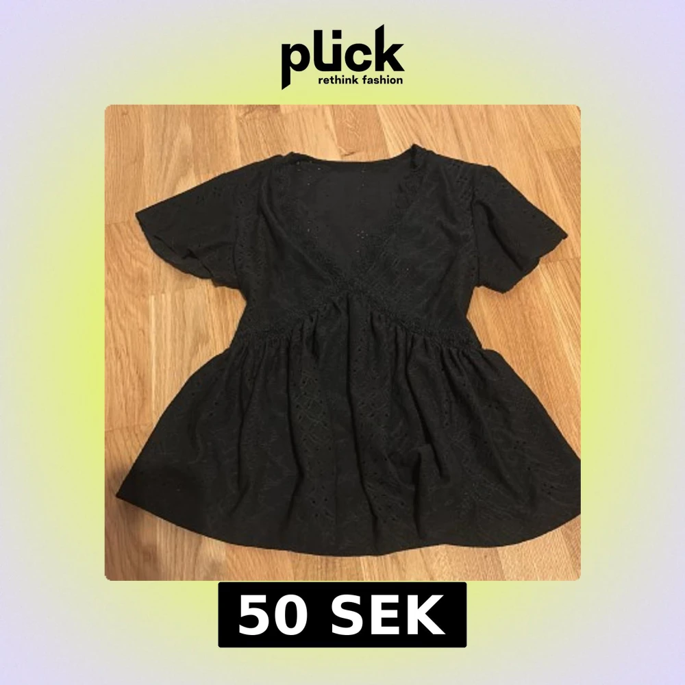 Svart blus med v-ringning och fina spetsdetaljer. Blusen har korta ärmar och ett omlottliknande liv, samt broderade hålmönster över hela tyget. Den har en luftig och lätt utsvängd passform som ger en söt och trendig look.