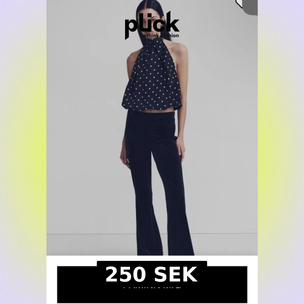 Snygg svart halterneck-topp från H&M i satin med vita prickar. Toppen har en croppad passform, knyts i nacken med en stor rosett och har öppen rygg. Har använt en gång