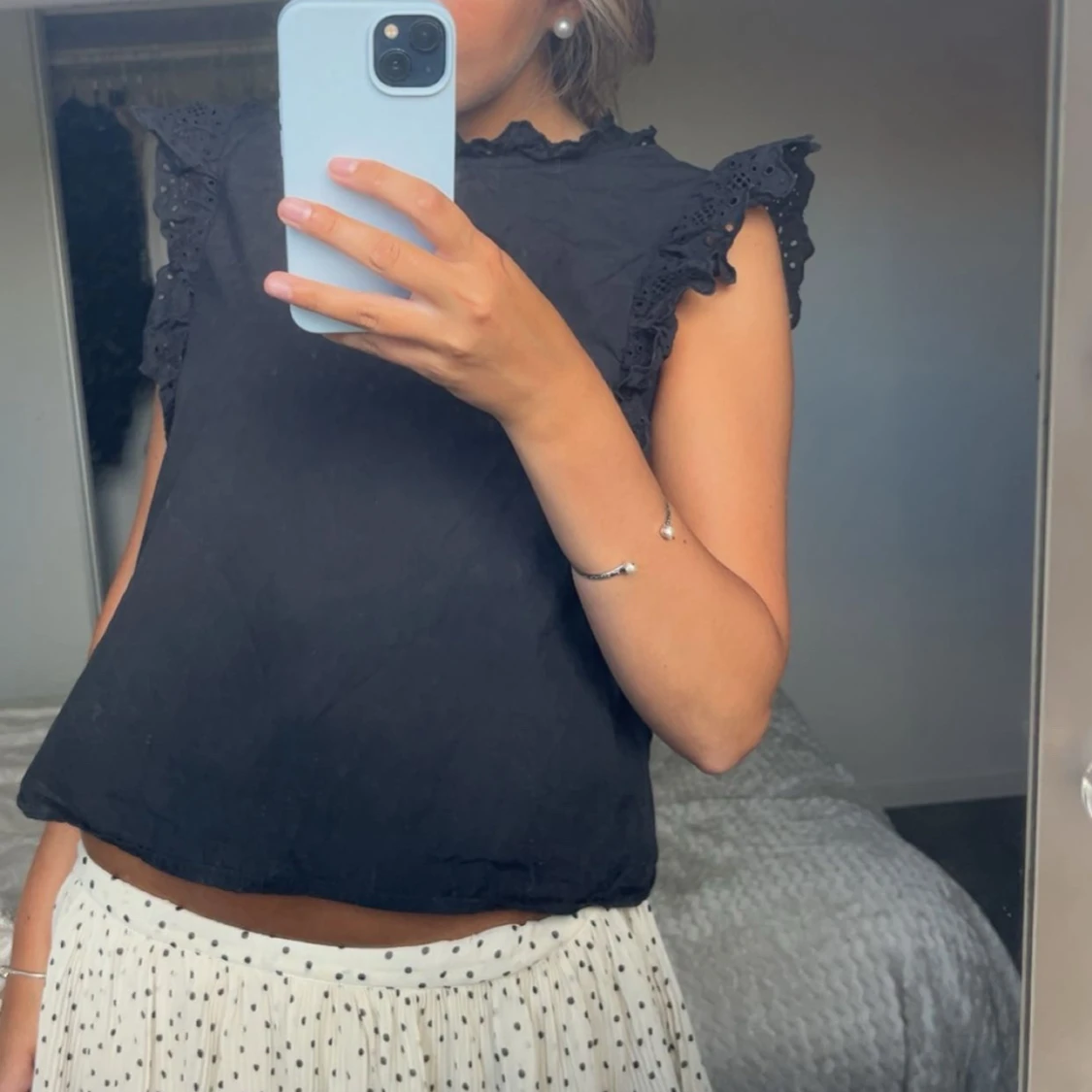 Supersöt svart blus med volangdetaljer på ärmarna och liten volang vid halsen. Ärmlös modell med broderade spetsdetaljer som ger en romantisk vibe. Perfekt att styla med kjol eller jeans för en trendig look.
