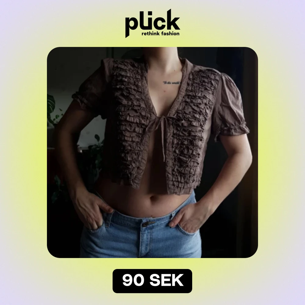 Topp med volanger från Soya. 🦋 I storlek L, sitter också fint på en M. Det finns en liten fläck, ej speciellt märkbar. - den är inringad på sista bilden. Annars i fint använt skick.