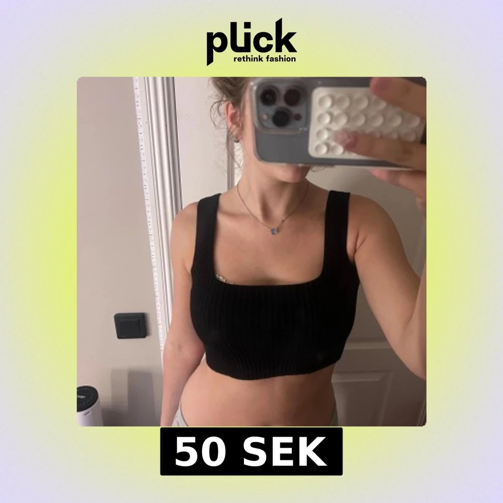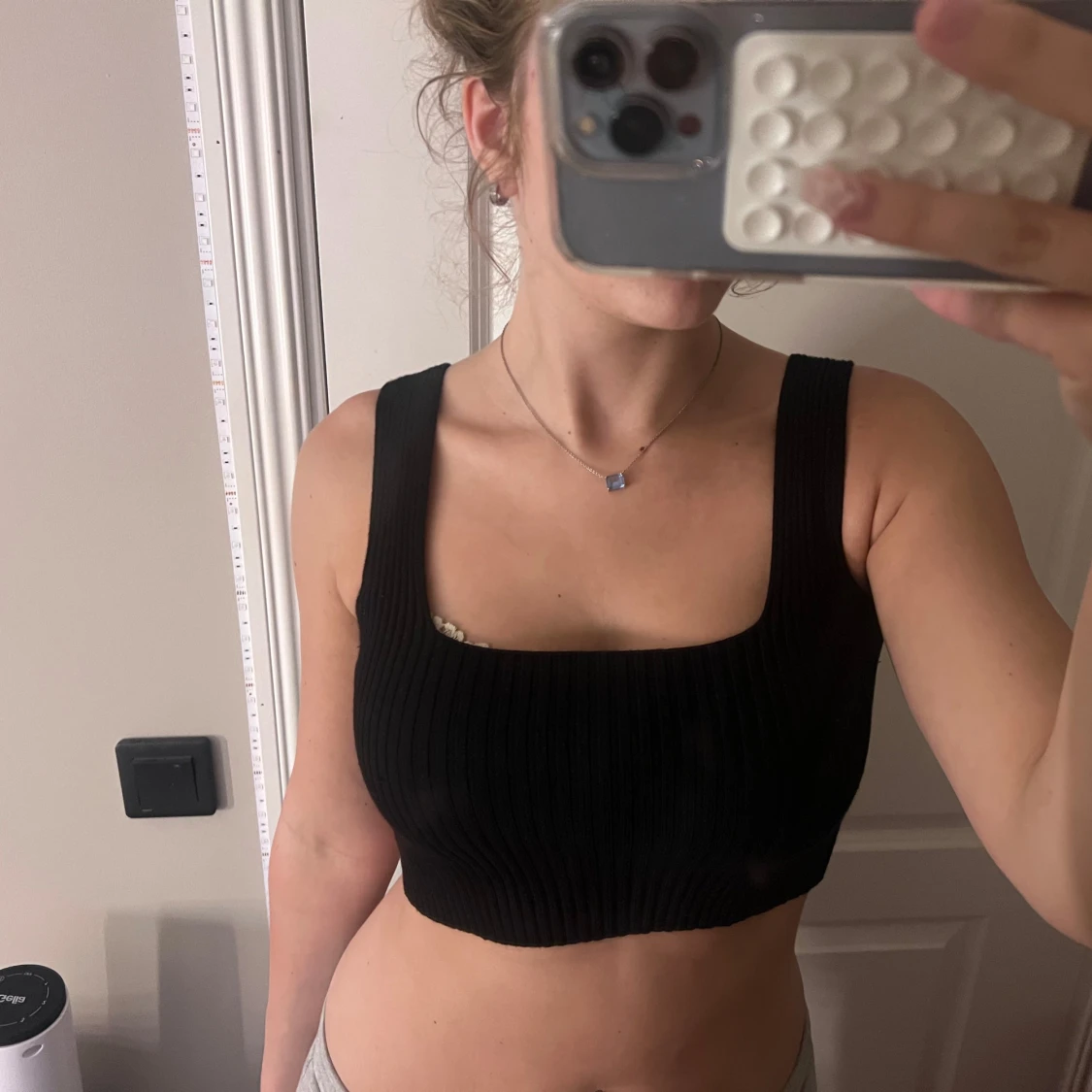 Säljer en svart croppad linnetopp med breda axelband och fyrkantig urringning. Toppen är ribbad och sitter tight mot kroppen, perfekt för att styla med låga jeans eller kjol. Enkel och stilren design som funkar till mycket. Skönt inför sommaren! 😍