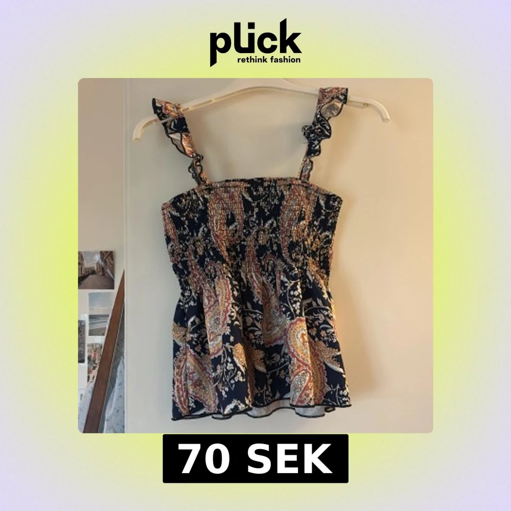 Säljer en blus med smockdetaljer och ett färgglatt mönster i blått, rött och gult. Blusen har breda axelband och en luftig passform, perfekt för sommardagar 🤍