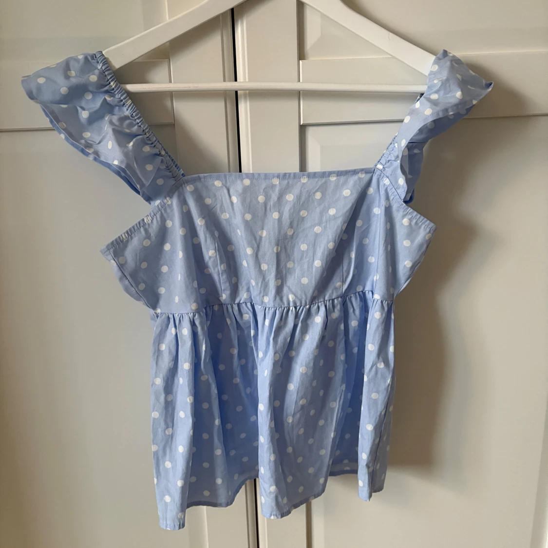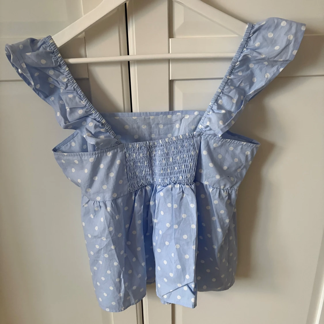Söt blå topp med vita prickar och volangdetaljer på axelbanden. Toppen har en smockad rygg och en luftig passform. Super fin nu till sommaren och även utomlands 😍