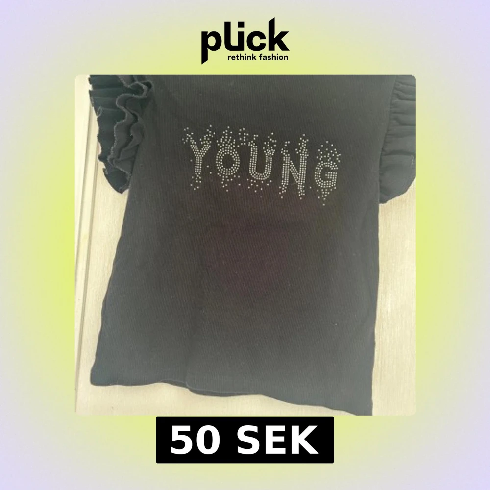 Svart ribbad topp från Gina Tricot med korta volangärmar och texten 'YOUNG' framtill i silvriga pärlor. T-shirten har en tight passform och är tillverkad i mjukt material som känns skönt mot huden. Perfekt för dig som vill ha en cool och trendig look.