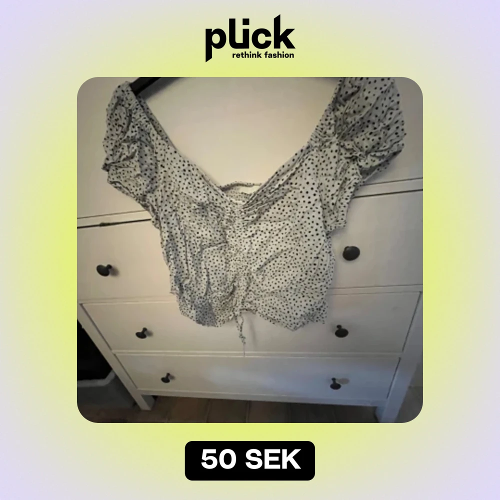 En vit blus med svarta prickar. Blusen har korta ärmar med rynkade detaljer och en knytning framtill. Den är tillverkad i ett lätt och luftigt material.