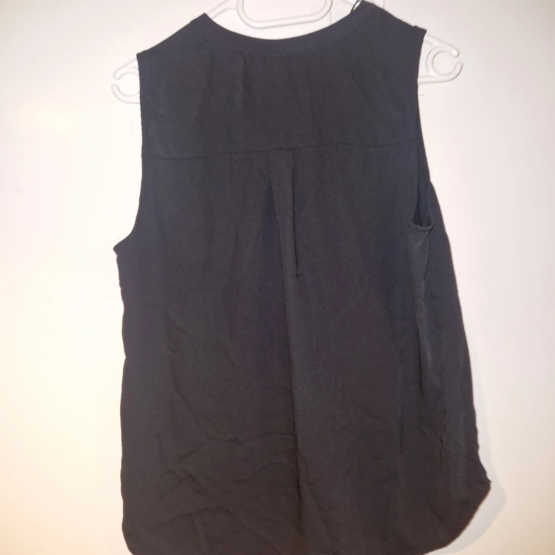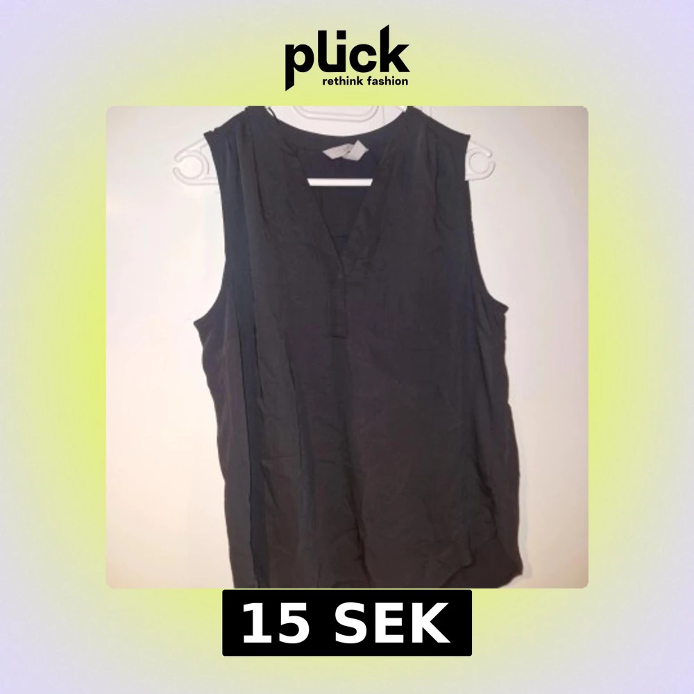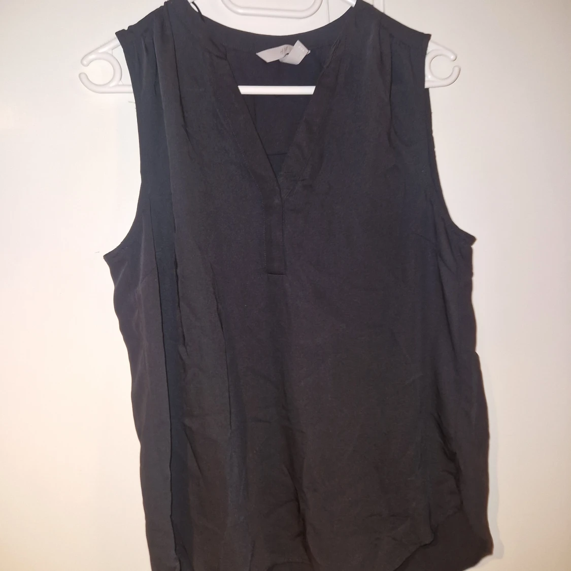 En stilren svart ärmlös blus från H&M med v-ringad hals och avslappnad passform. Toppen är tillverkad i ett mjukt och lätt material, perfekt för varma dagar. Enkel design som funkar till många olika looks.
