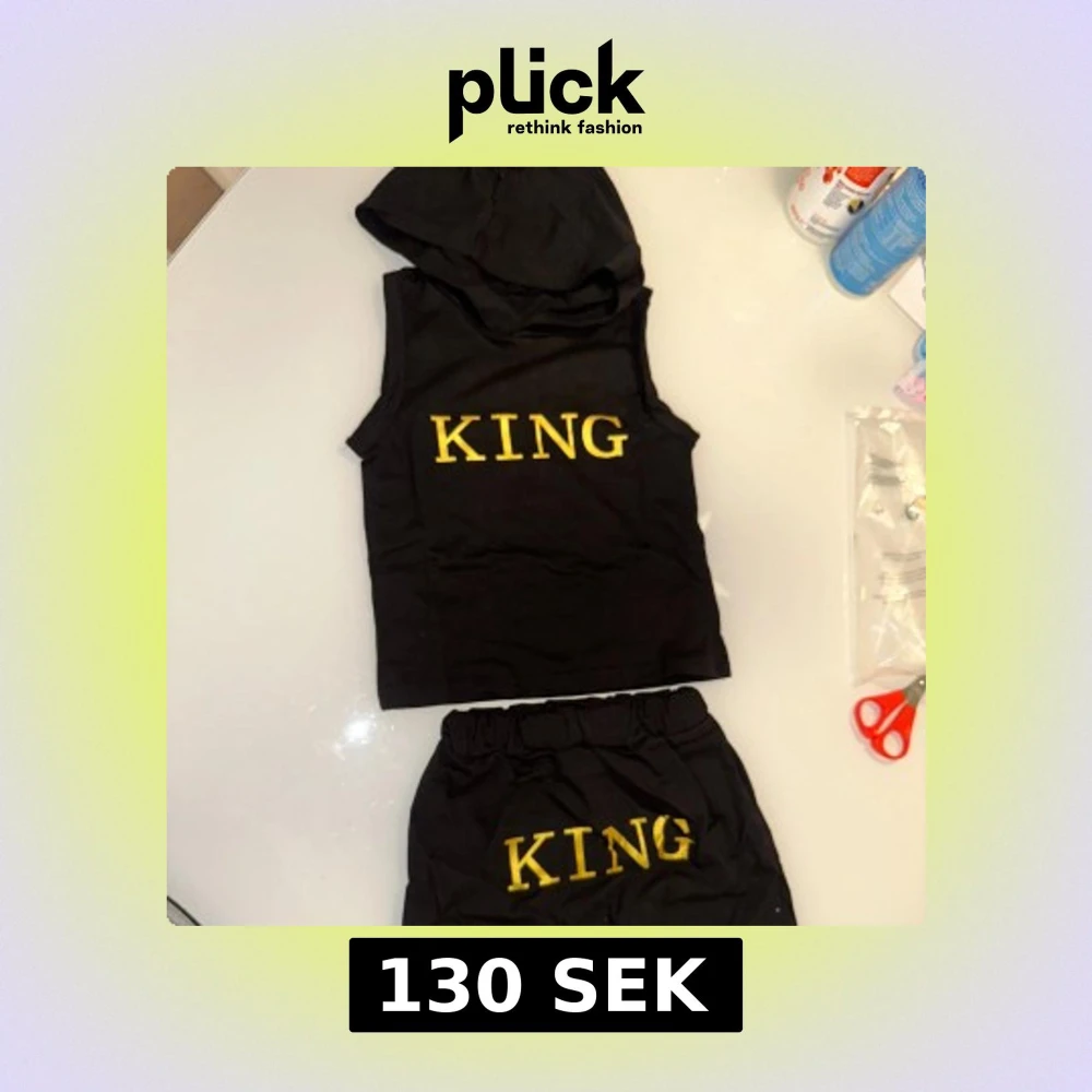 Snygg svart ärmlös huvtröja med texten 'KING' i gult på bröstet. Perfekt för en cool och avslappnad stil. Matchande svarta shorts ingår. Passar barn mellan 1 år och 3.