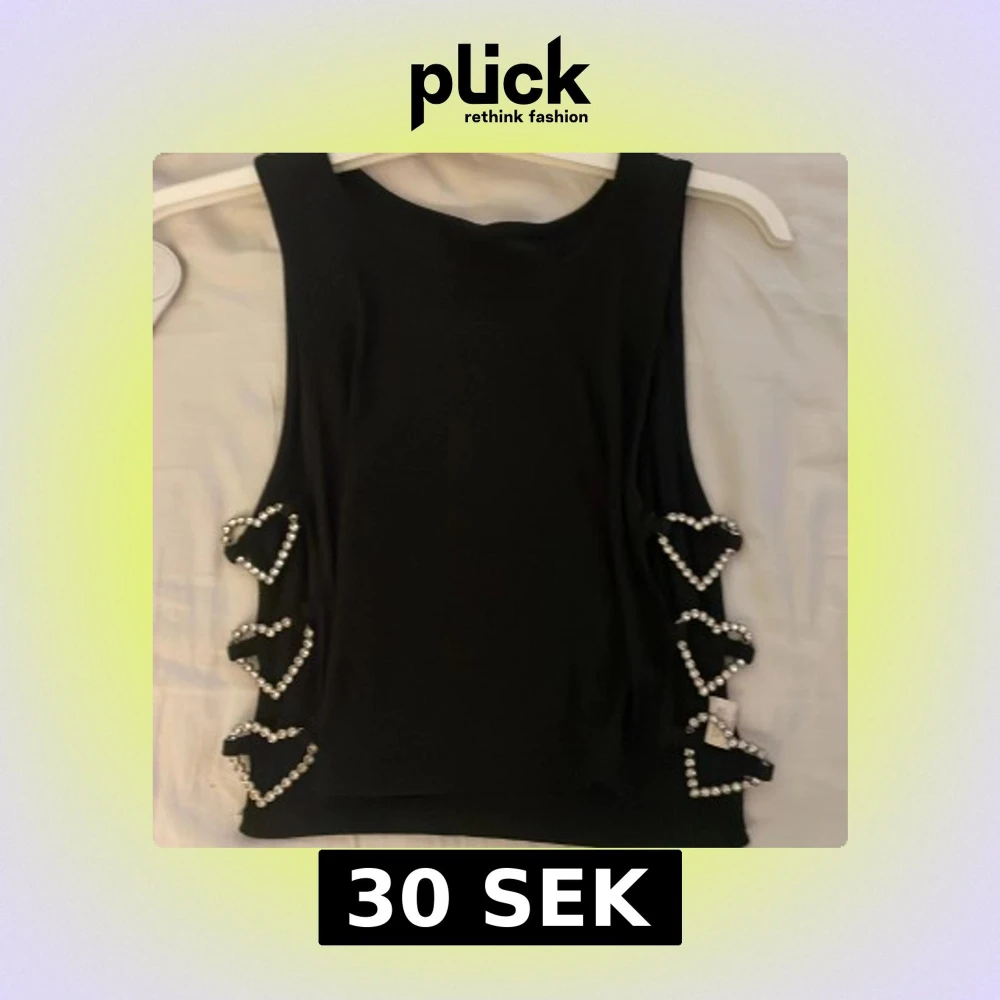 Supersnygg svart ärmlös topp med öppna sidor där tre hjärtformade detaljer i silverfärgade stenar sitter på varje sida. Toppens tyg är lätt ribbat och ger en cool look. Perfekt för dig som vill sticka ut med glittriga detaljer och unik design.