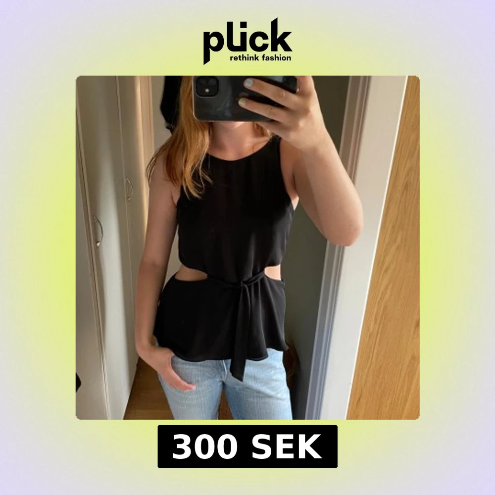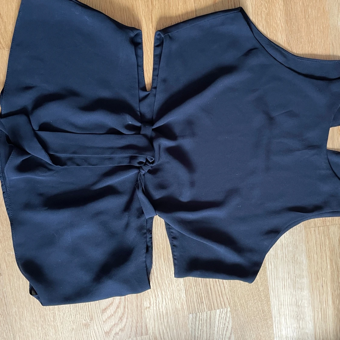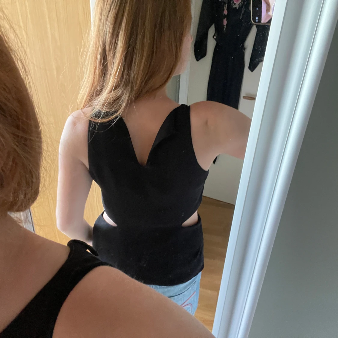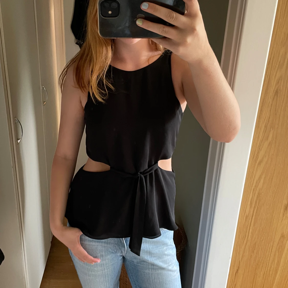 Snygg svart ärmlös topp med cut-outs i midjan och knyt framtill. Toppen har rund halsringning och en cool v-formad rygg. Materialet är mjukt och faller snyggt, perfekt till jeans eller kjol för en trendig look. Gammal från zara