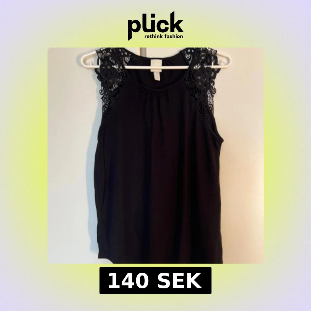 Svart ärmlös topp från H&M i storlek XS. Toppen har snygga spetsdetaljer med blommönster på axlarna och en rund halsringning. Perfekt för dig som gillar en stilren look med lite extra detaljer.