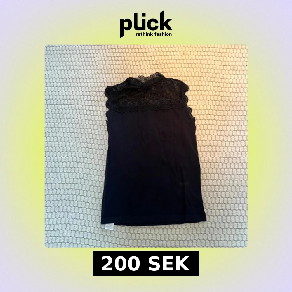 Snygg svart ärmlös topp med vacker spetsdetalj vid halsen. Perfekt för en elegant look. Toppen har en tight passform och är tillverkad i ett mjukt material. S/M