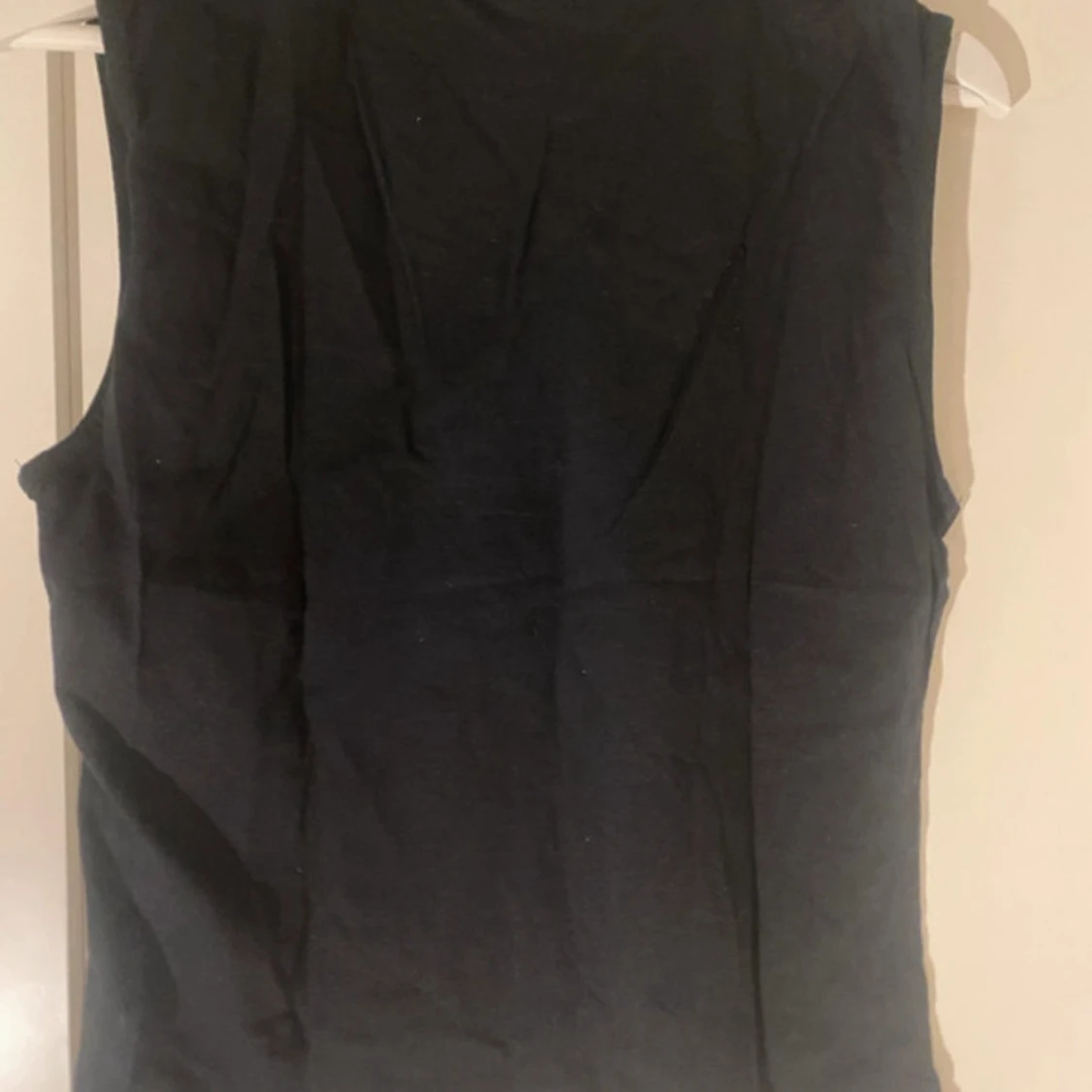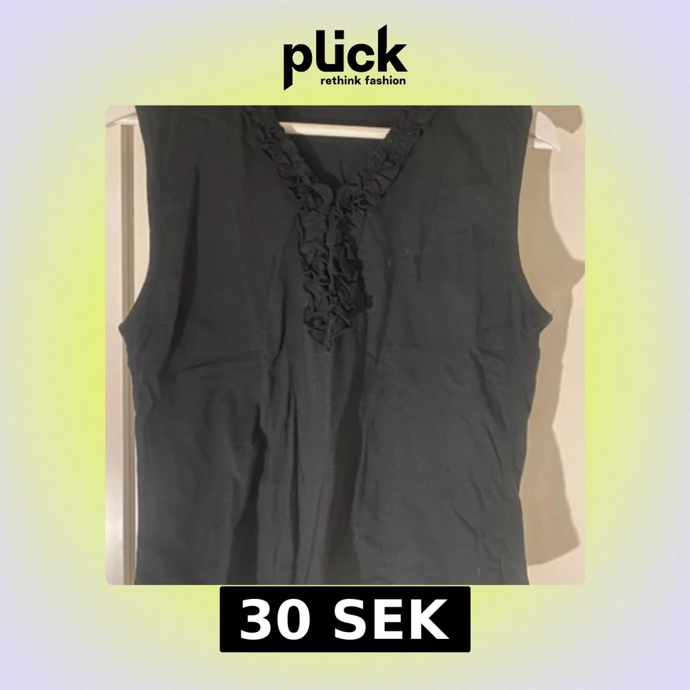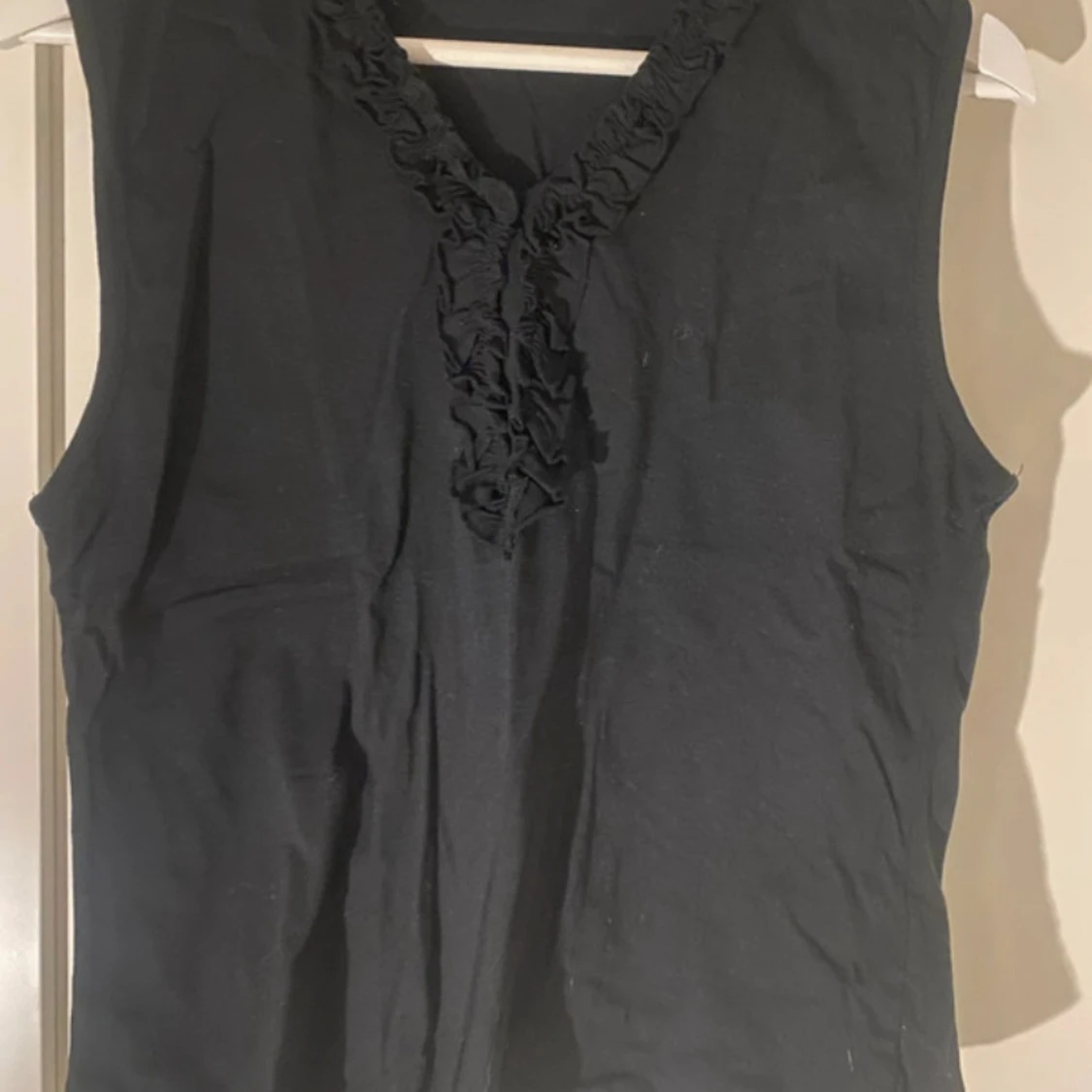 Svart ärmlös topp med snygg volangdetalj längs v-ringningen framtill. Perfekt att styla till både jeans och kjol. Mjukt material i bomull. Från Soft. Skriv till mig om du har några frågor eller är intresserad!