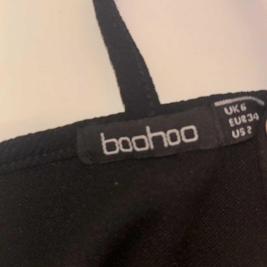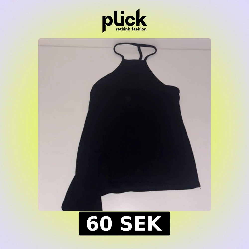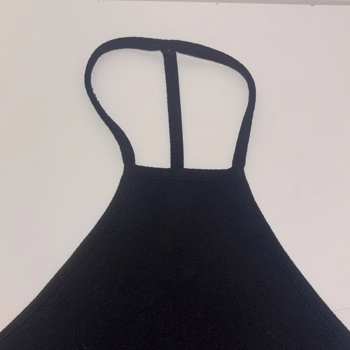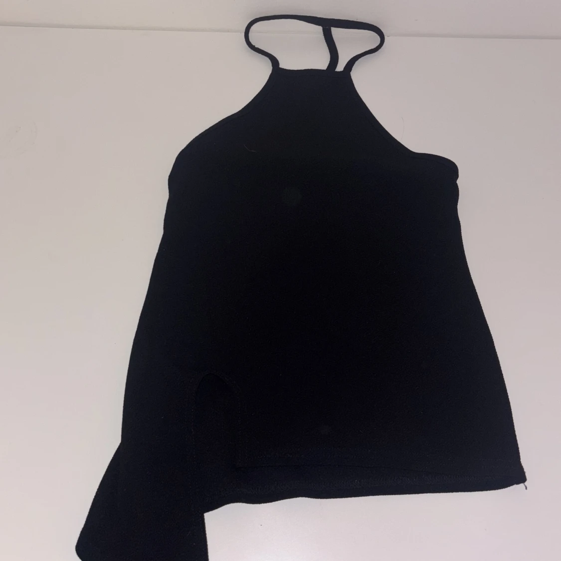 Säljer en svart halterneck topp från Boohoo i storlek 34. Toppen har smala axelband, asymmetrisk nederkant med slitsdetalj och är ärmlös. Perfekt för dig som gillar minimalistisk och trendig stil.