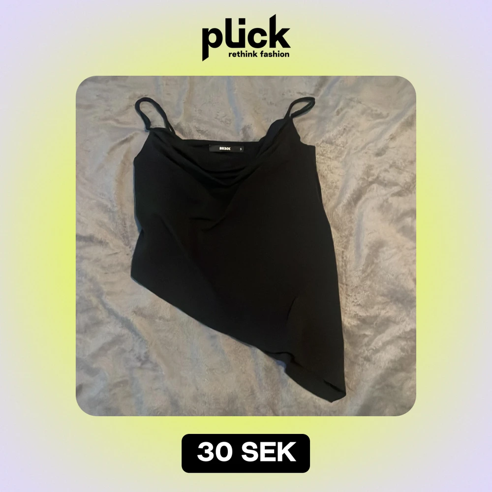 Snygg svart asymmetrisk topp från Bik Bok i storlek S. Den har tunna axelband och en unik snedskuren design som ger en cool look. Perfekt för en utekväll eller fest!