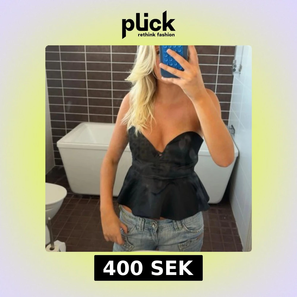 Säljer en svart axelbandslös topp med peplumskärning och djup v-ringning. Toppen har en figurnära passform upptill och volang nertill som ger en snygg siluett. Perfekt att styla med jeans eller kjol för en trendig look.