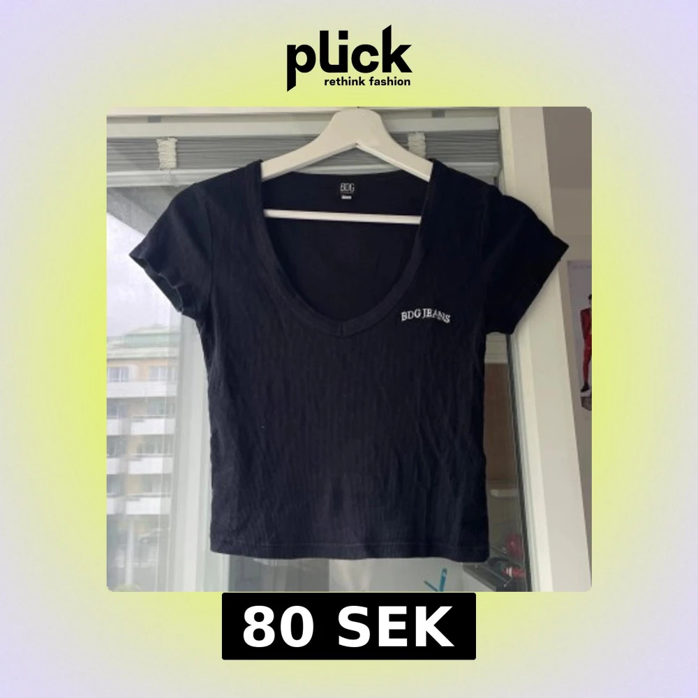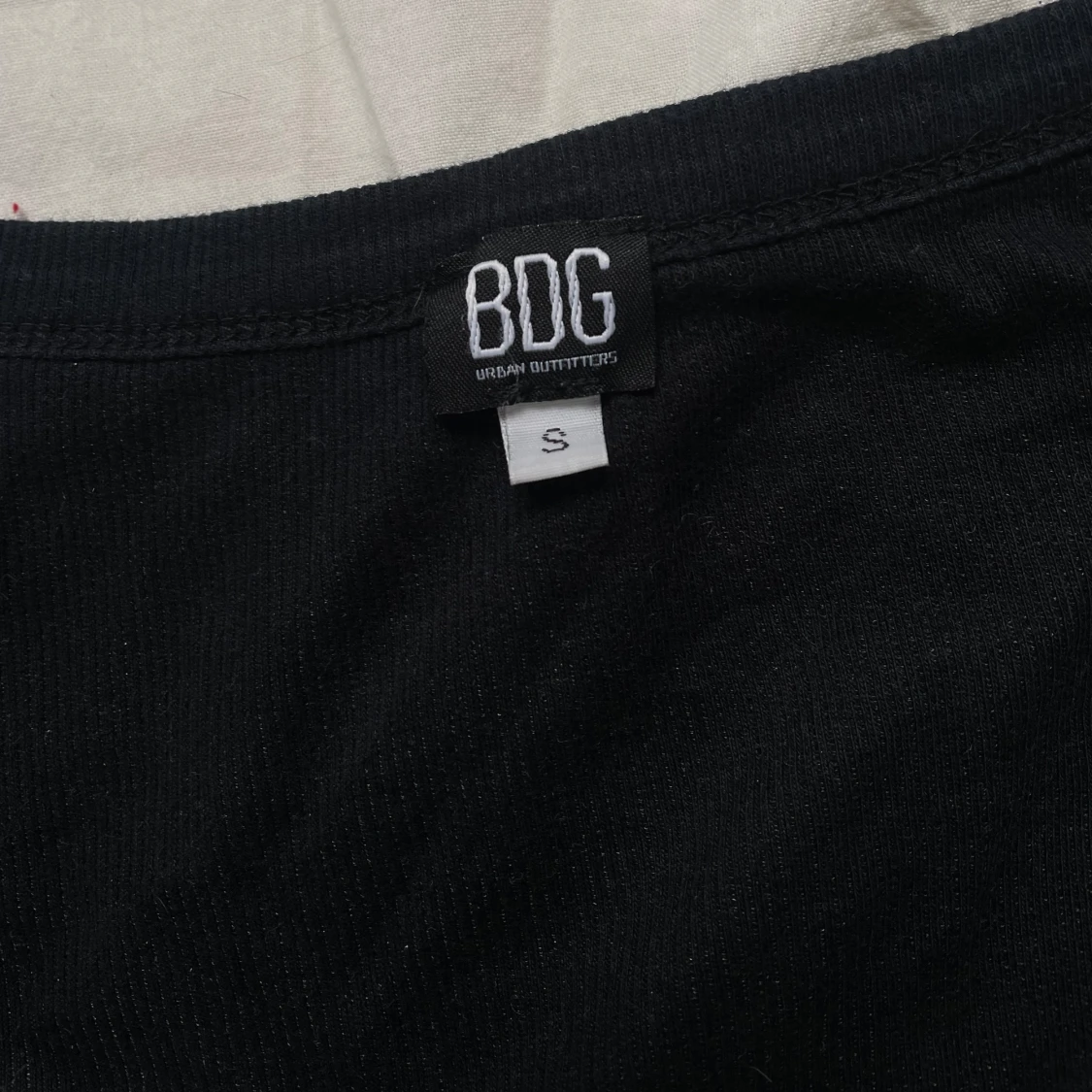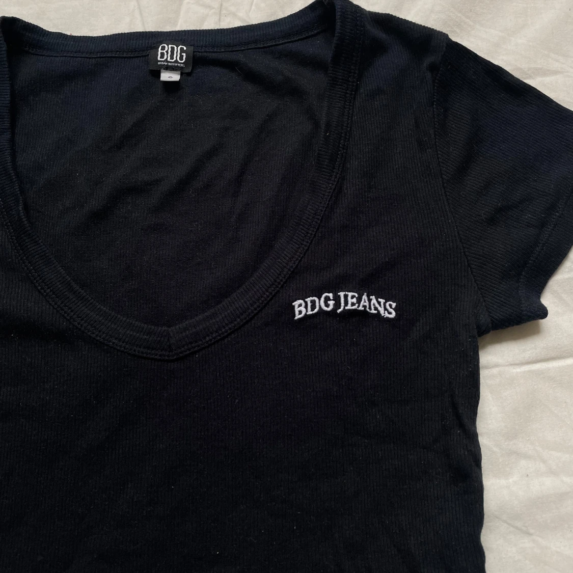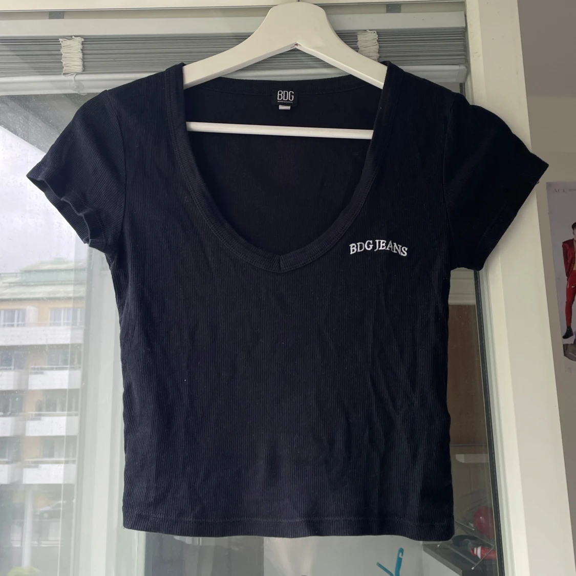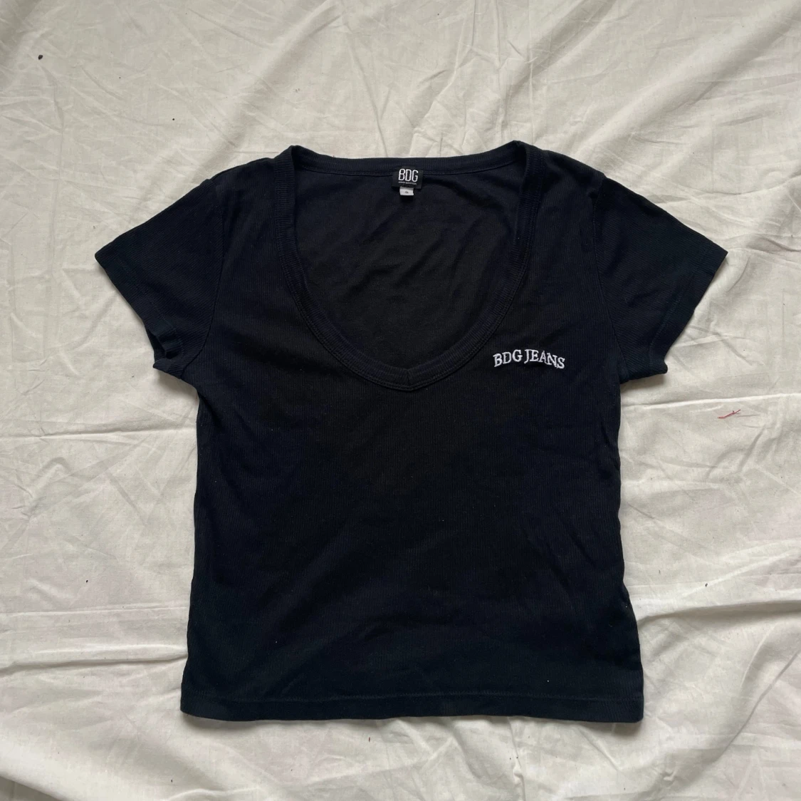 Svart ribbad baby tee från Urban Outfitters BDG Jeans med broderad vit logga på bröstet. Djup v-ringning och korta ärmar ger en clean och stilren vibe. Använd ett fåtal gånger men i sjukt fint skick.