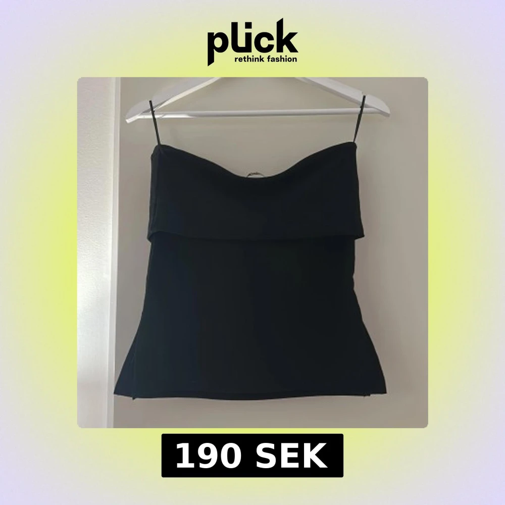 Säljer en svart bandeau tubtopp från Gina, aldrig använd endast testad, perfekt för utgång, storlek M, den har även ”slits” på sidan av tröjan som jag glömt ta bild på
