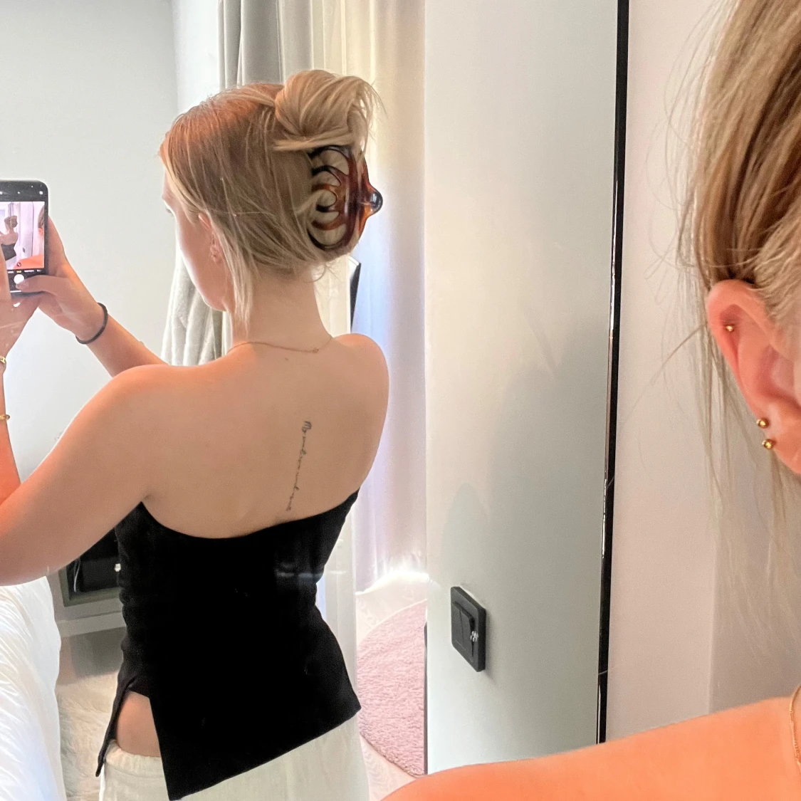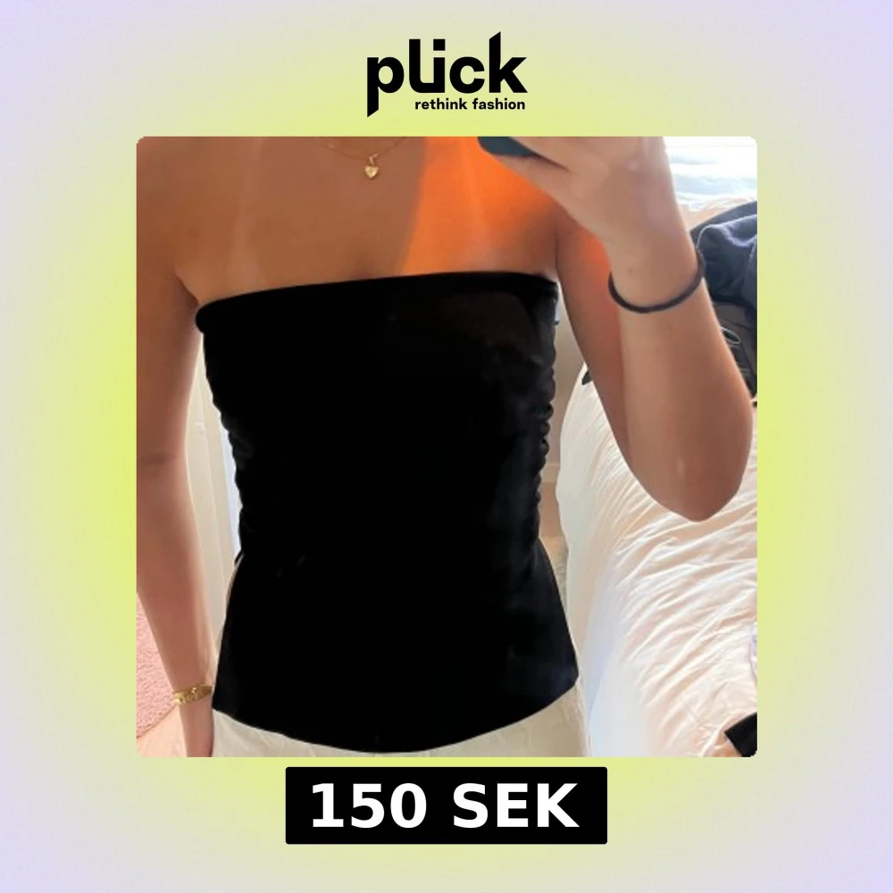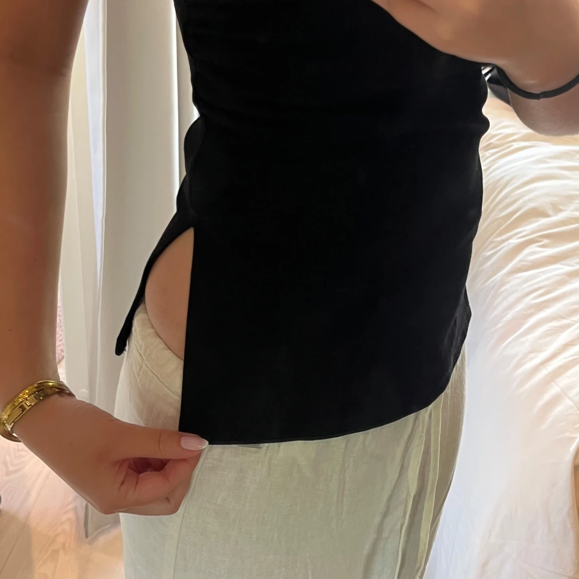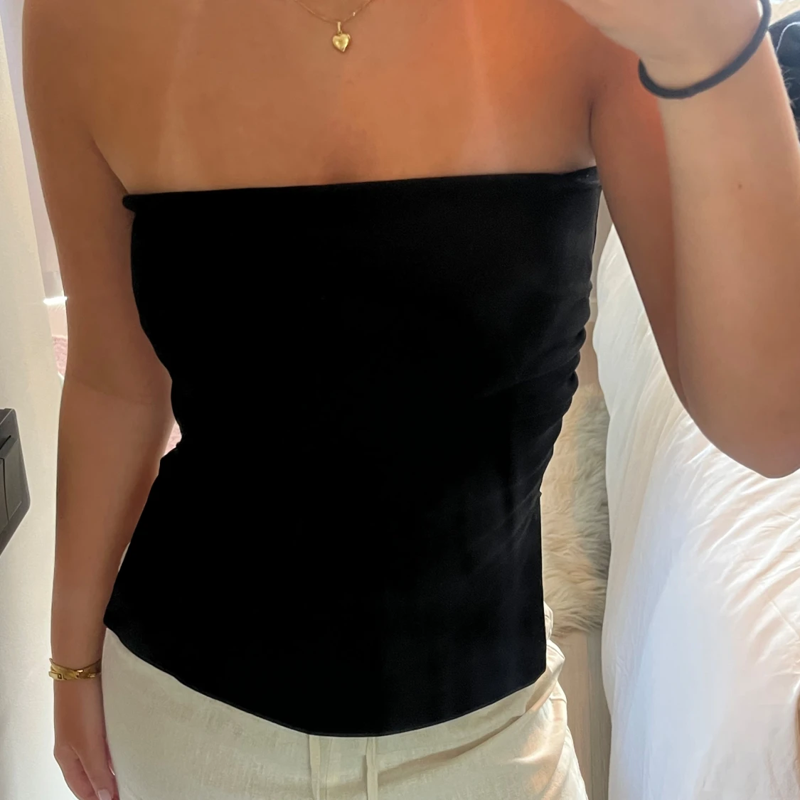 Säljer en svart bandeau tubtopp med slits på sidan. Toppen är axelbandslös och har en tight passform som sitter snyggt mot kroppen. Perfekt för dig som gillar minimalistisk stil och vill ha en enkel men trendig topp till sommaren.