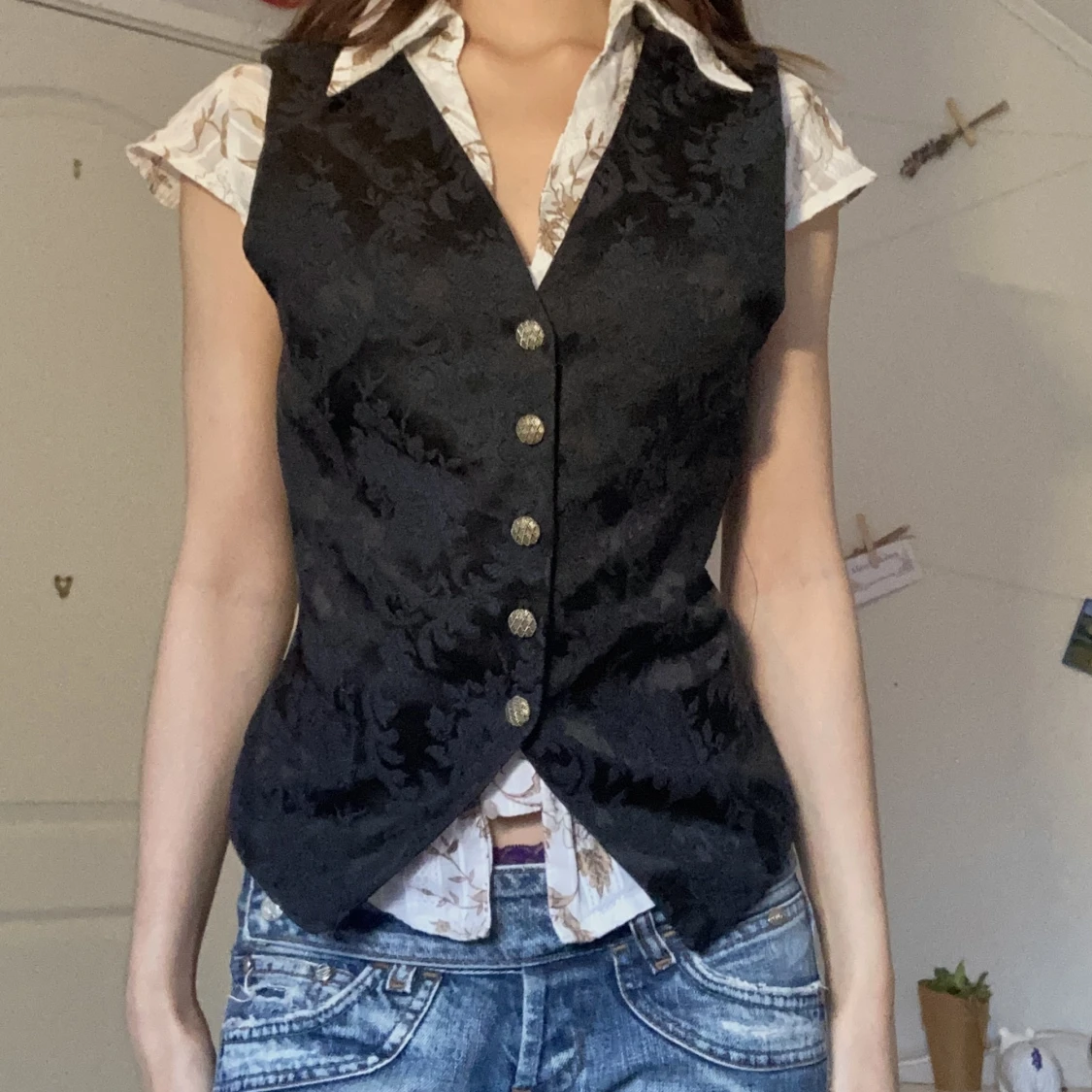 Mönstrad kostymväst i jättebra skick och kvalite! Band på baksidan för att kunna adjust the tightness runt midjan:) Bomull på framsidan och polyester på baksidan. Passar både män och kvinnor! ❤️märke: Jacqueline