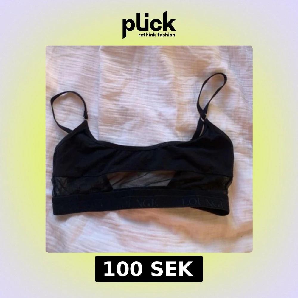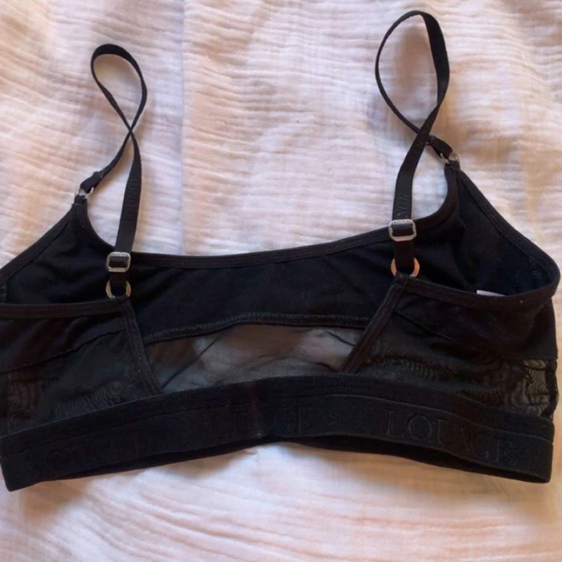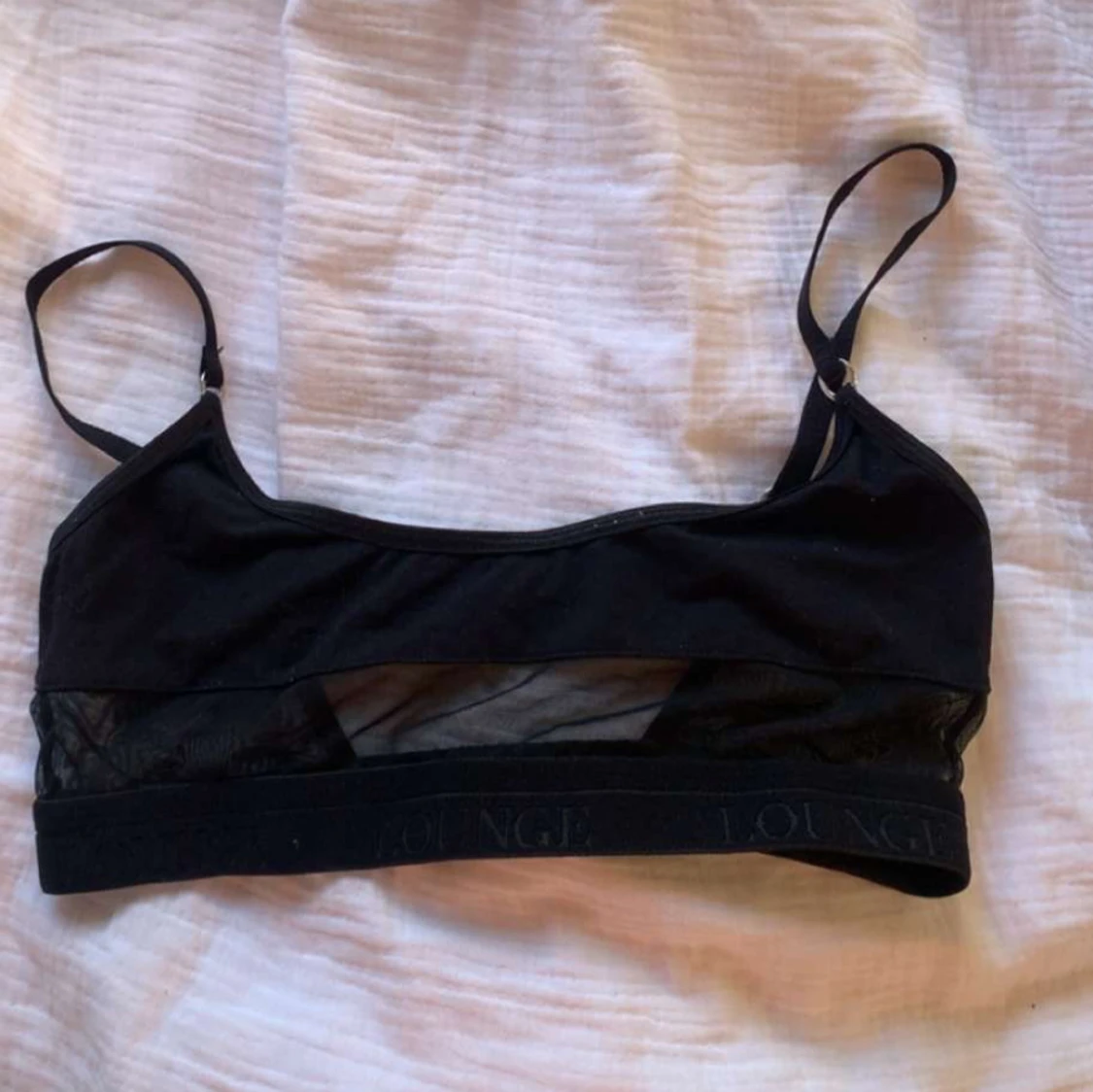 Säljer en svart bh från Lounge med justerbara axelband och meshdetaljer under bysten. Toppen har en bred resår nertill med Lounge-logga och är perfekt för en avslappnad stil.