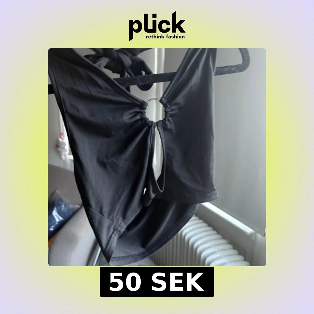 Snygg svart tröja med cool ringdetalj framtill och knytband i nacken. Tröjan har en stilren design med ett litet urklipp under ringen som ger en trendig touch. Materialet känns mjukt och följsamt mot huden.