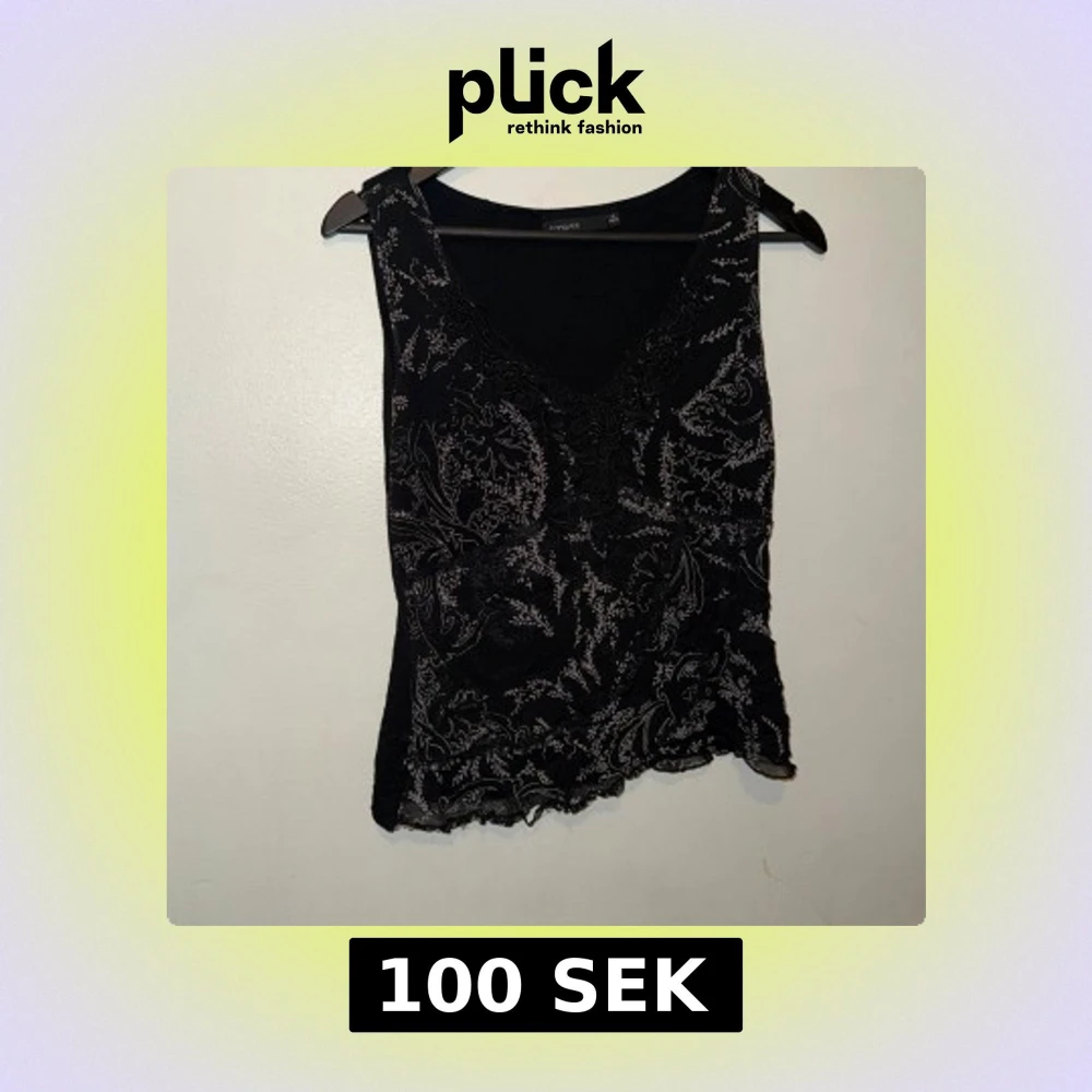 Svart linnetopp från Vero Moda med blommigt mönster i grått och spetsdetaljer vid v-ringningen. Toppen är ärmlös och har en lätt vågig kant nedtill. Perfekt för dig som gillar en stilren men ändå detaljerad look.