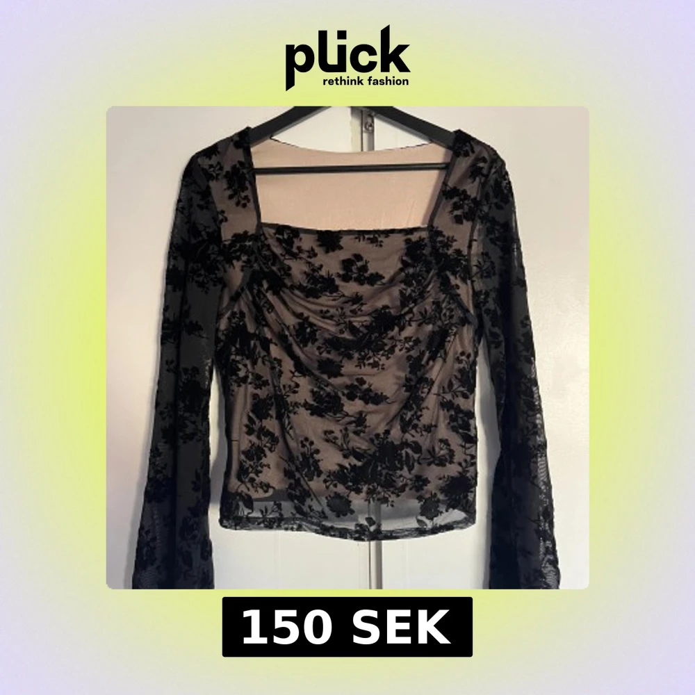 Snygg svart mesh-topp med blommigt mönster. Toppen har långa ärmar och en draperad framsida som ger en elegant look.