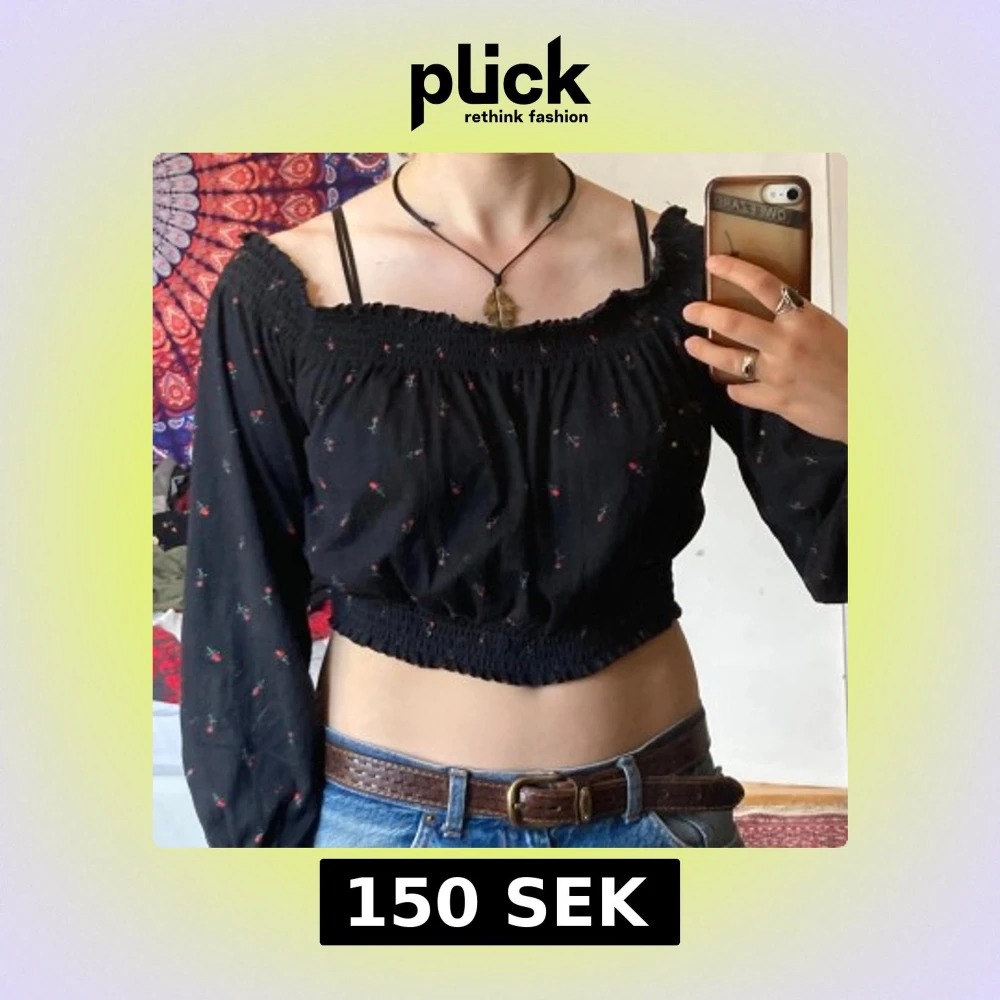 Supersöt svart offshoulder blus med små röda rosor på. Croppad modell med resår i midjan och vid halsringning. Långa ärmar med resår vid handlederna. Perfekt för sommaren! Superskönt material, bomull. Var min absoluta favoritröja ett tag, men använder tyvärr för sällan nu!