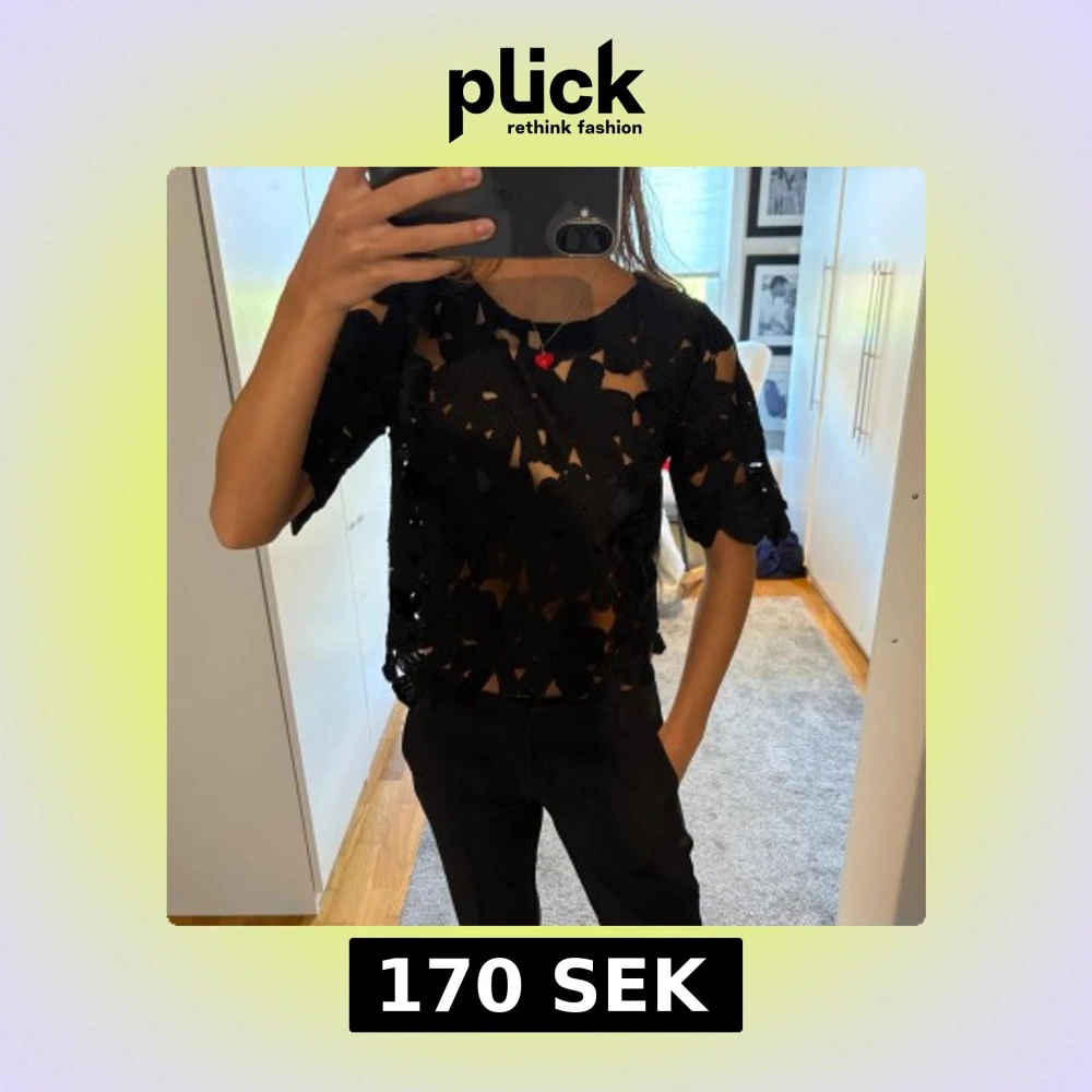 Säljer en svart blus med stora blommiga spetsdetaljer och korta ärmar.