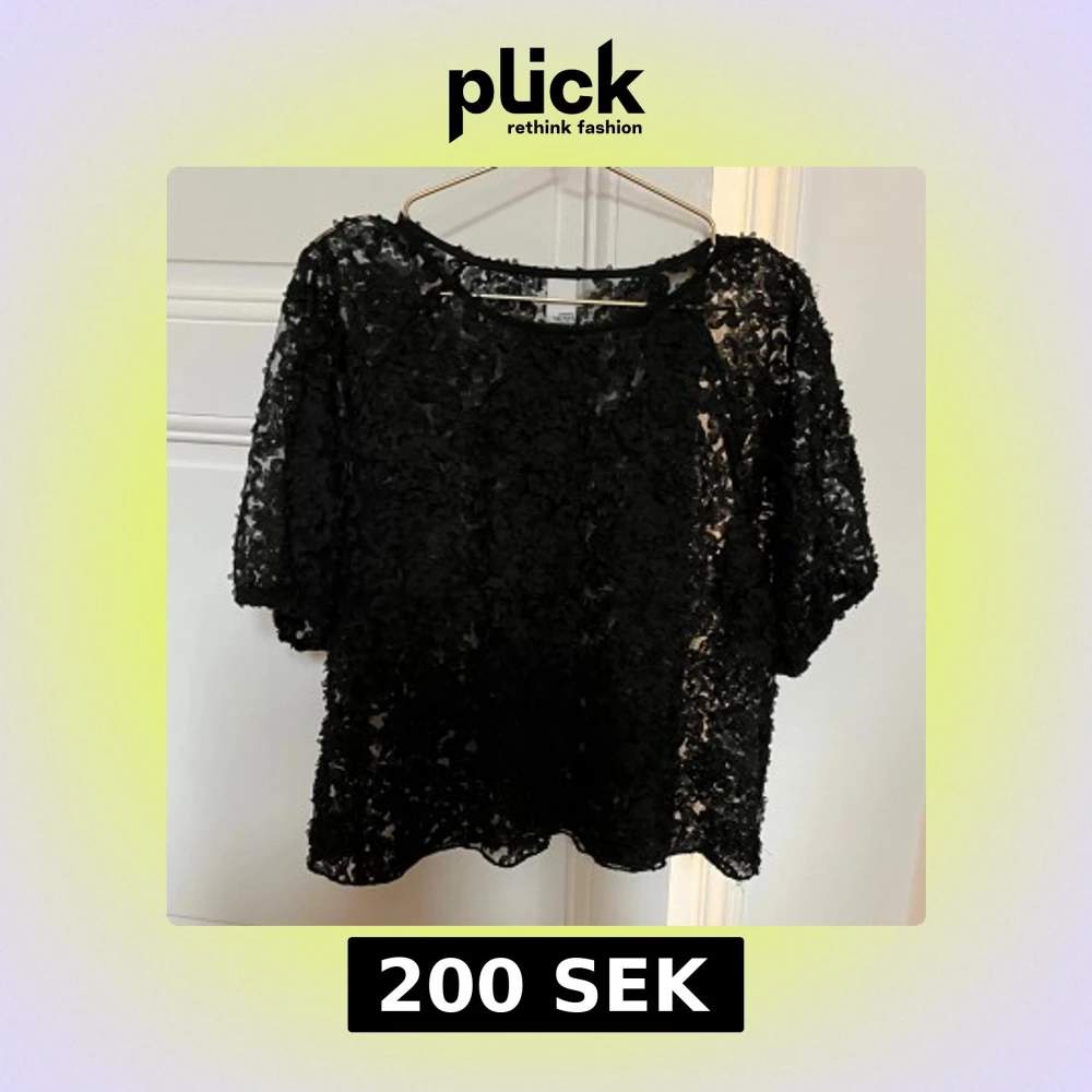 Säljer en svart blus med blommig spets och transparent look. Blusen har korta ballong ärmar och rund halsringning.