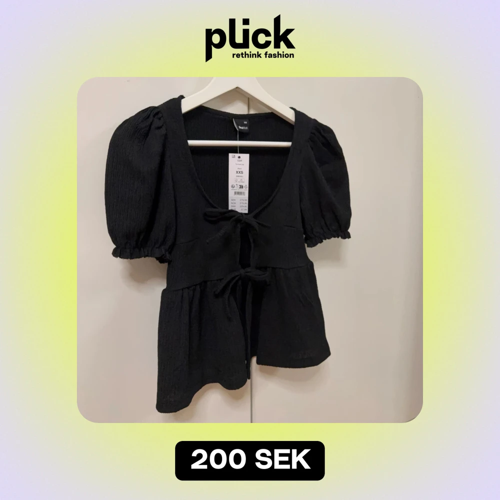Säljer en supersnygg svart blus från Gina tricot i storlek XXS. Den har korta puffärmar och en söt knytning framtill. Perfekt för både vardag och fest! Säljes pga för liten🥰