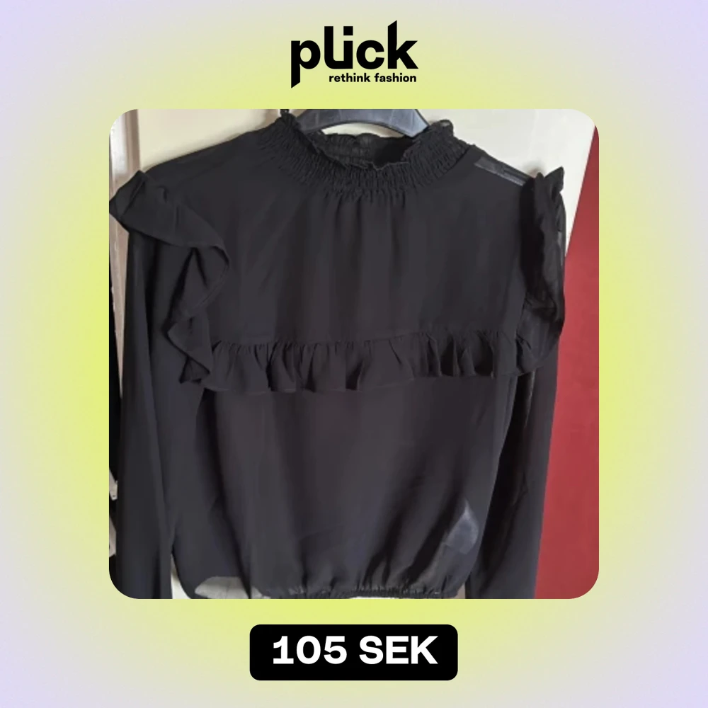 Säljer en elegant svart blus från Gina Tricot i storlek 36. Blusen har långa ärmar med volangdetaljer och en smockad halsringning samt ärmslut. Materialet är lätt och genomskinligt, perfekt för både vardag och fest. Blusen har en lös passform och är superbekväm att bära.