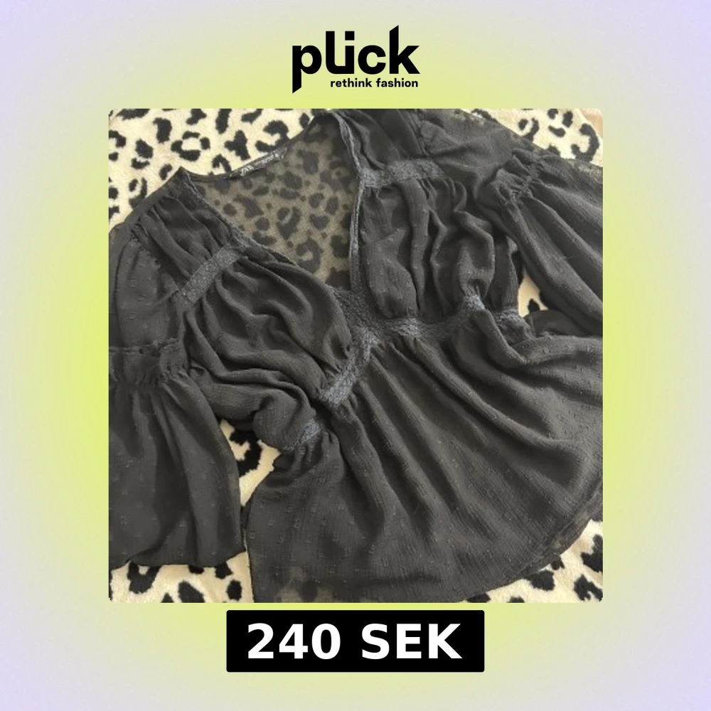 (PASSAR SOM ETT S) Supersnygg svart blus från Zara med v-ringning och transparenta partier. Blusen har lång puffärm, markerad midja och diskret rutstruktur i tyget. Luftigt material som ger en cool och trendig look. Perfekt att styla med jeans eller kjol.