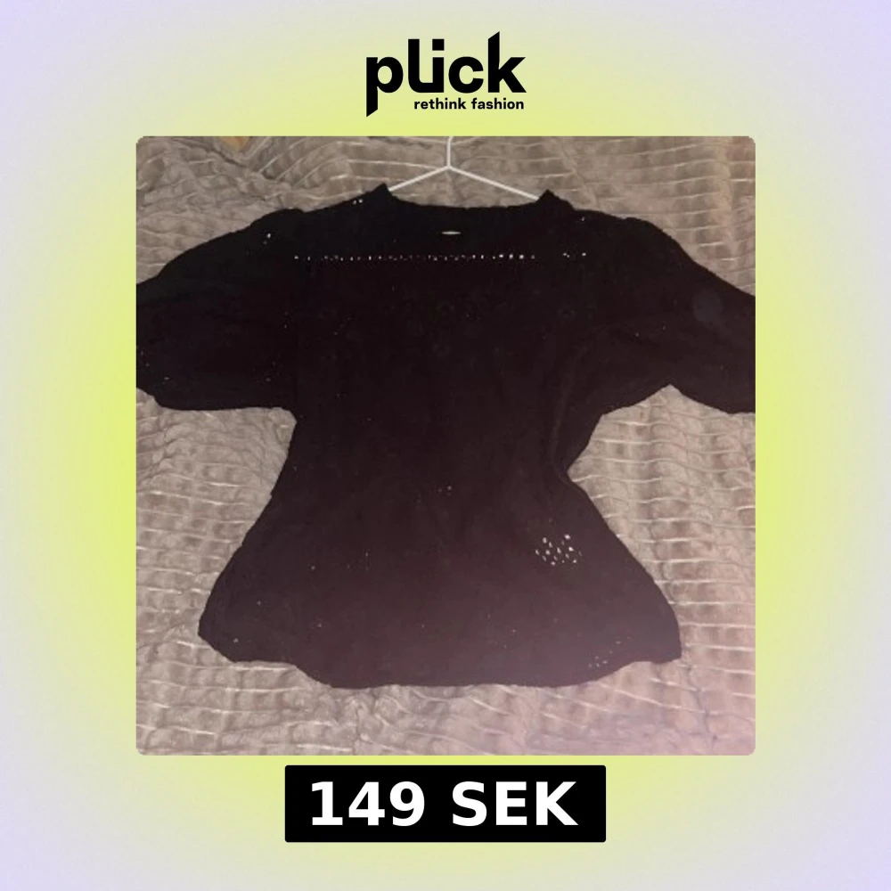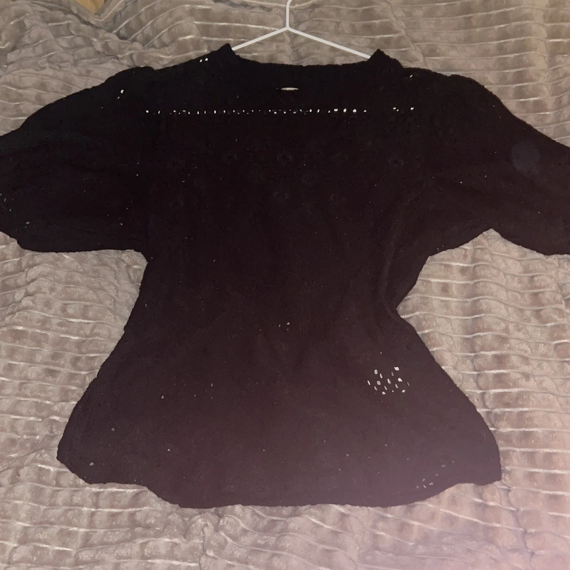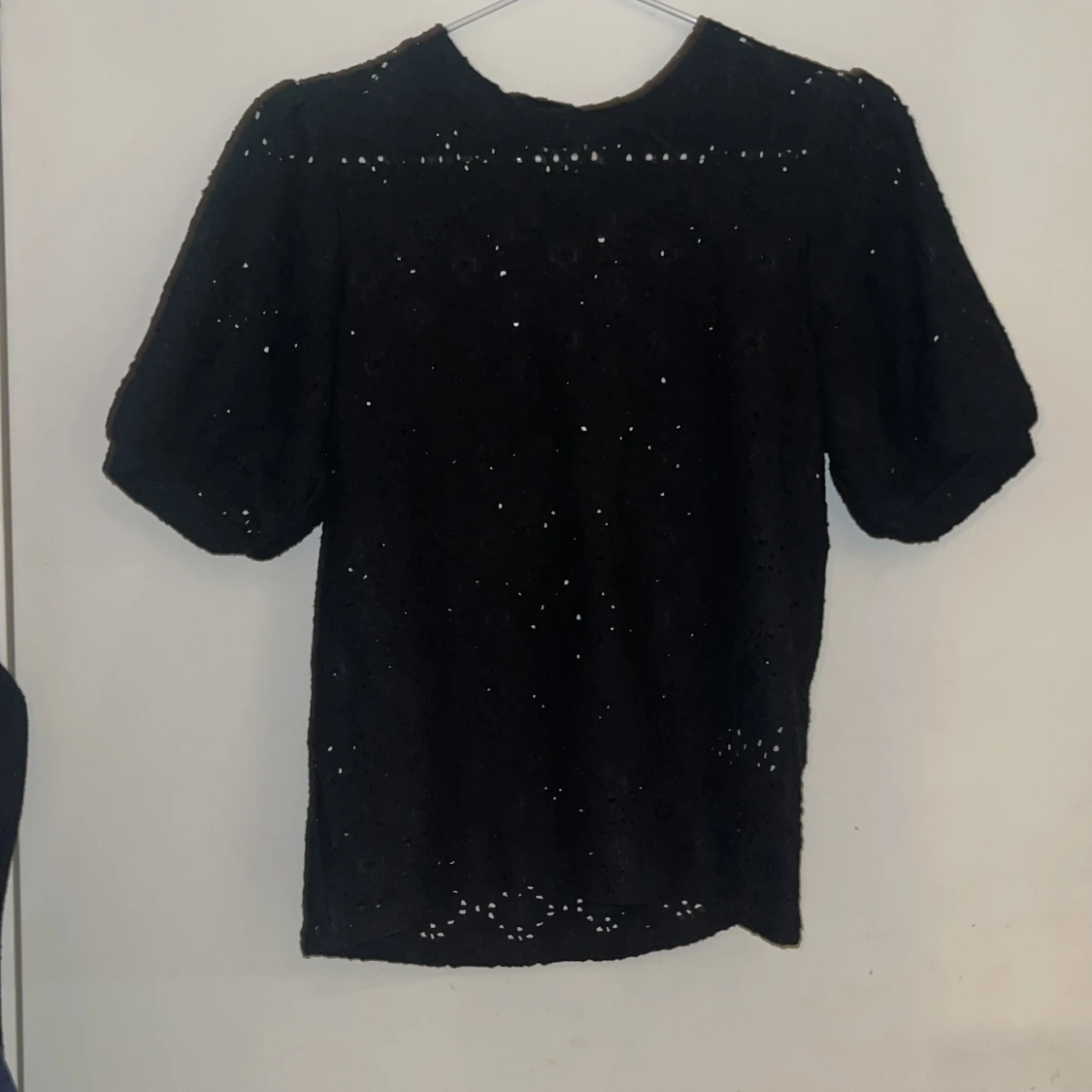 Säljer en svart blus med broderade hål och puffiga korta ärmar. Blusen har rund halsringning och ett feminint, luftigt tyg med fina detaljer. Perfekt för dig som gillar en stilren men ändå unik look.