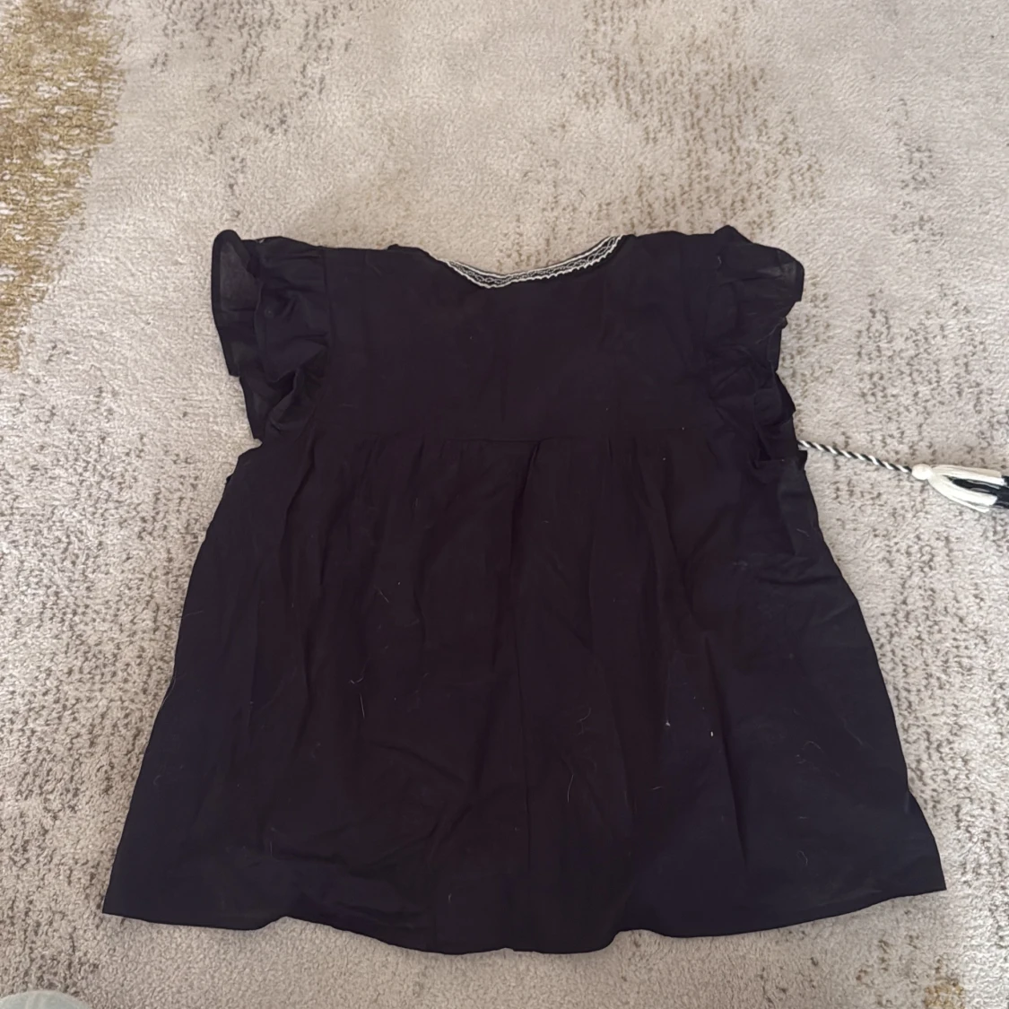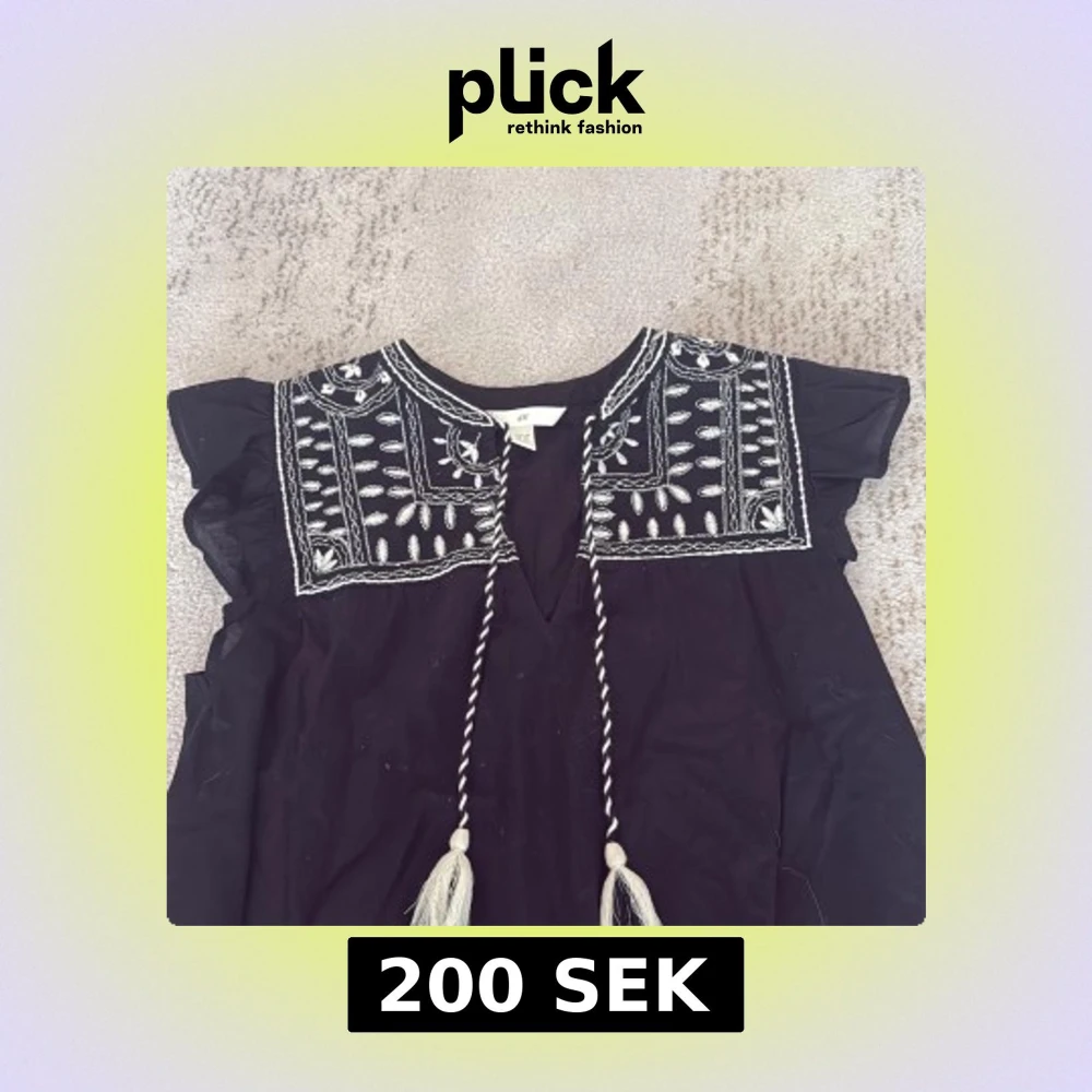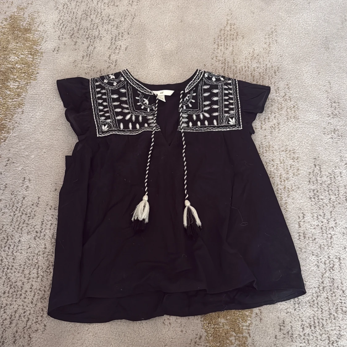 Svart blus från H&M med vita broderier och snygga detaljer vid axlarna. Blusen har korta volangärmar, v-ringning och dekorativa snören med tofsar framtill. Blusen säljs inte längre❤️