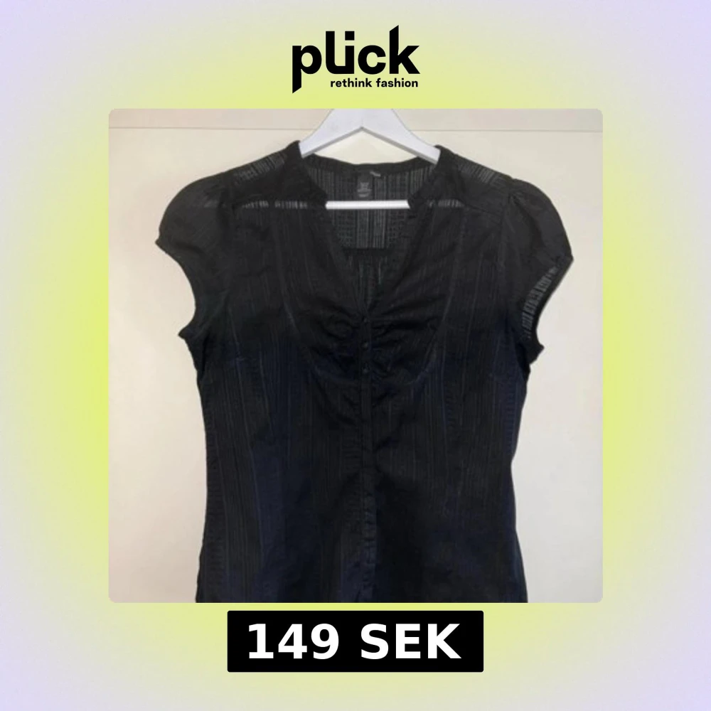 Svart blus från H&M med subtila ränder i tyget, v-ringning och små knappar framtill. Tunt, lätt material och korta ärmar med lätt puff. Perfekt för dig som gillar en stilren look med lite extra detalj. Storlek:XL men skulle säga M/L