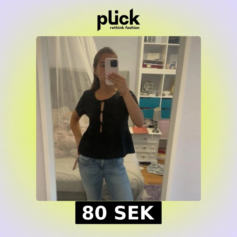 Säljer en svart blus med kort ärm och tre dekorativa knyt framtill. Blusen har en lätt utsvängd passform och rundad halsringning. Perfekt för dig som gillar trendiga detaljer och enkel stil.