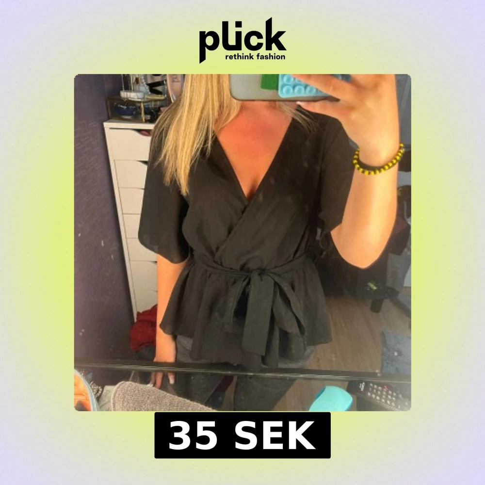 Snygg svart blus med v-ringning och breda, korta ärmar. Blusen har ett knytband i midjan som ger en markerad siluett och ett flowigt fall nedtill. Perfekt att styla med jeans eller kjol för en trendig look.