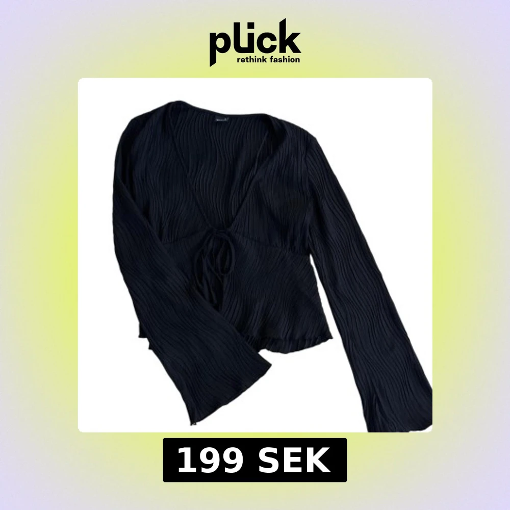 Snygg svart blus från Gina Tricot med v-ringning och knytning framtill. Blusen har långa ärmar och ett plisserat tyg som ger en elegant look. Perfekt för att höja din stil till nästa nivå.