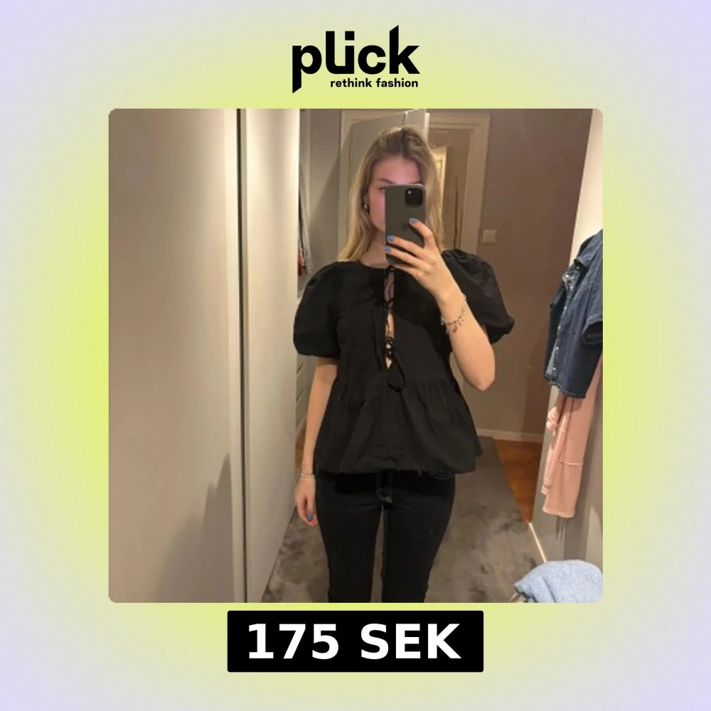 Säljer en svart blus med puffiga korta ärmar och knytning framtill. Endast använd fåtal gånger🩷🩷