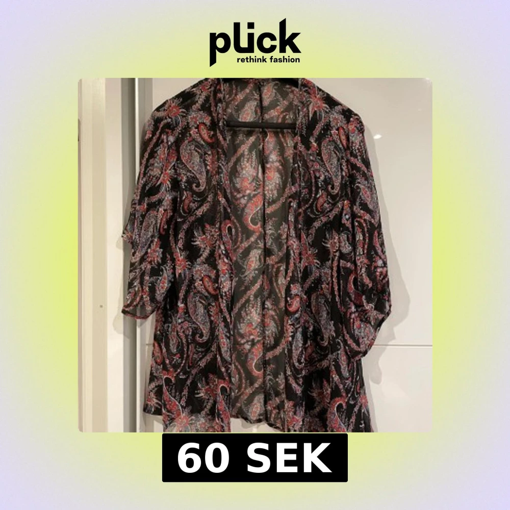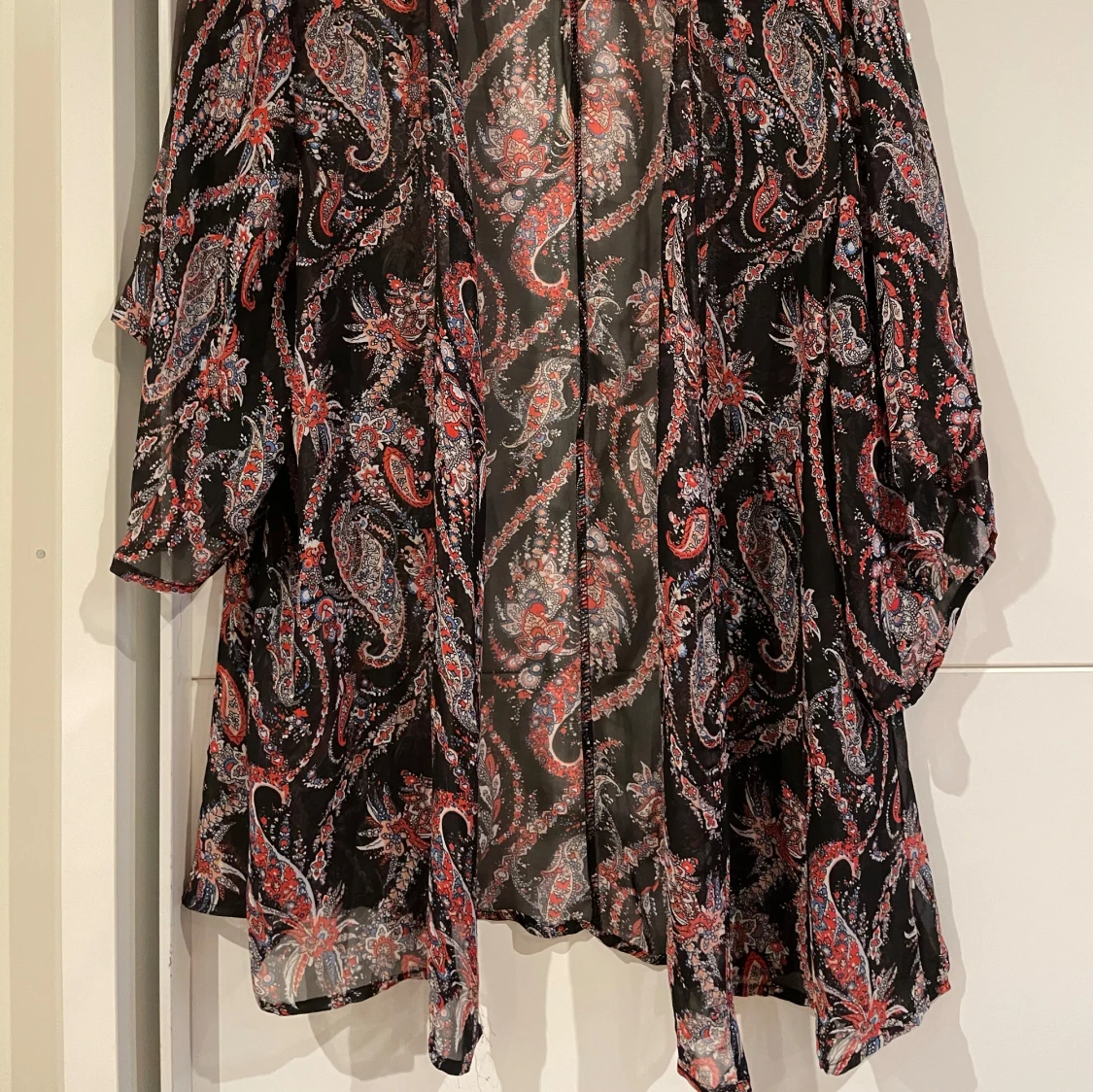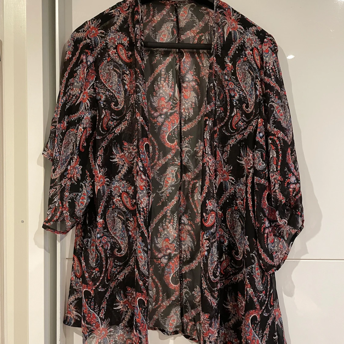 Säljer en luftig och transparent svart blus med färgstarkt paisleymönster i rött, vitt och blått.