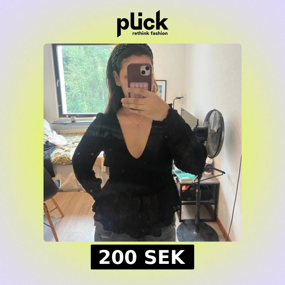 Säljer en svart blus med transparenta, prickiga meshärmar och djup v-ringning. Blusen har smockade muddar och volang nertill, vilket ger en snygg siluett. Perfekt för dig som gillar trendiga detaljer och en feminin look.