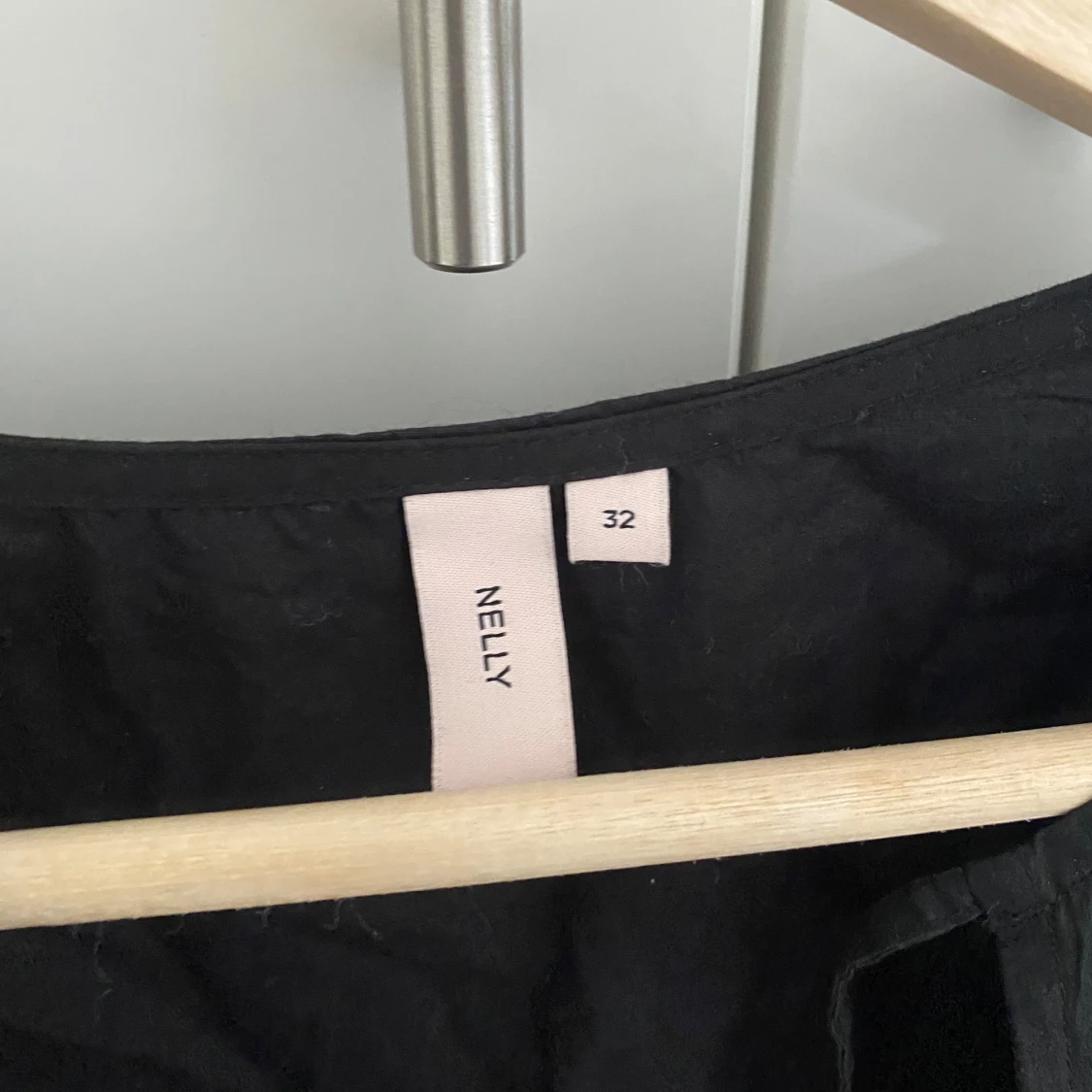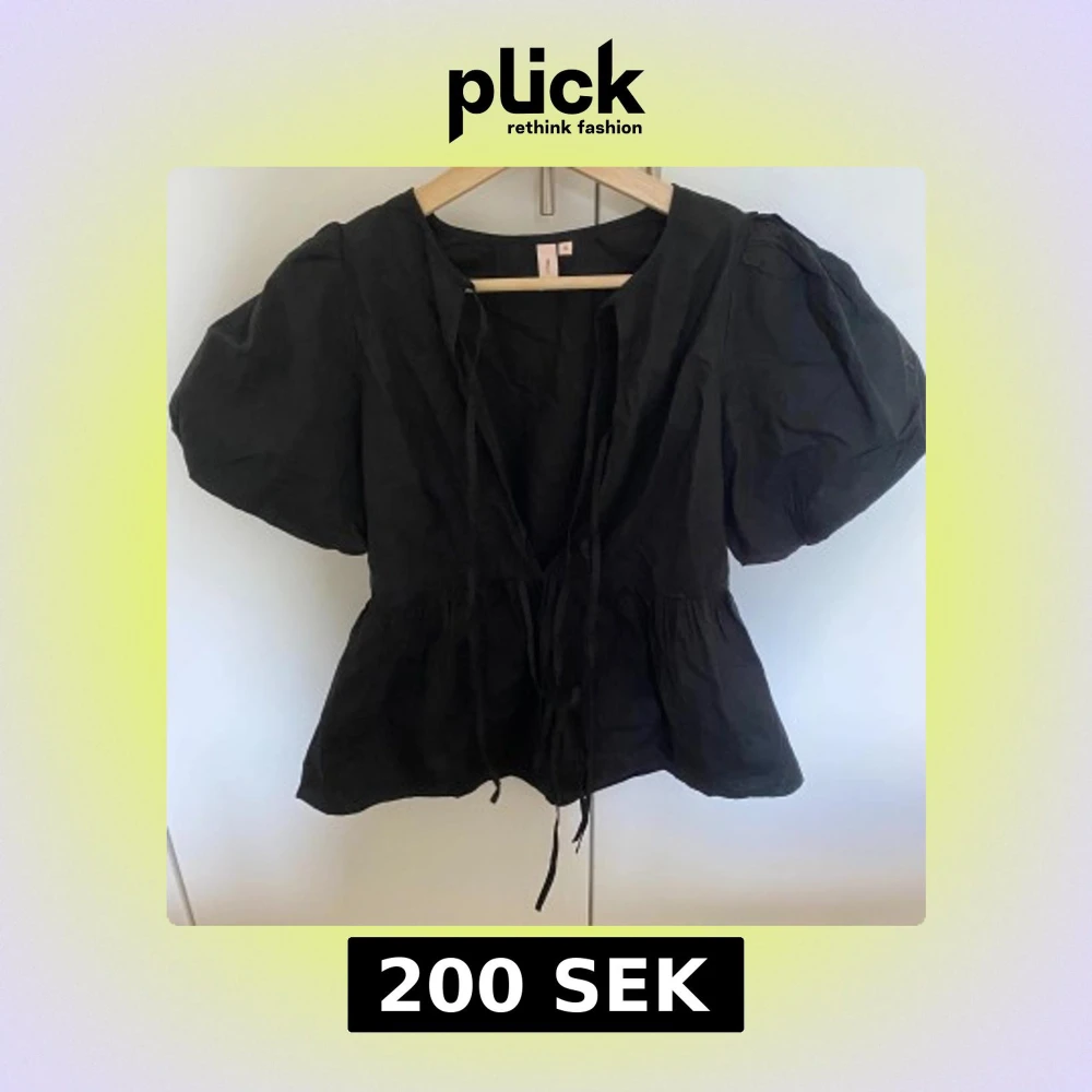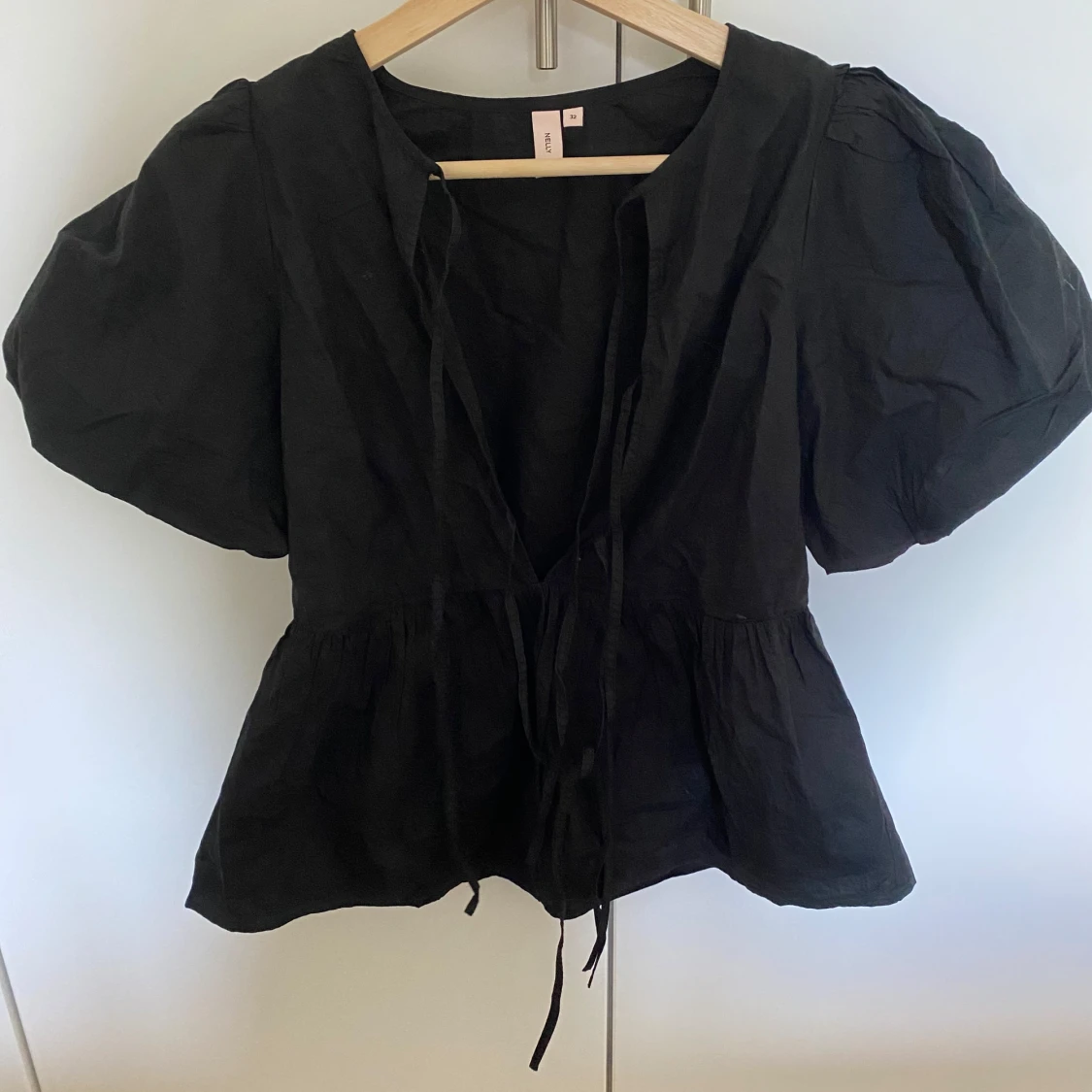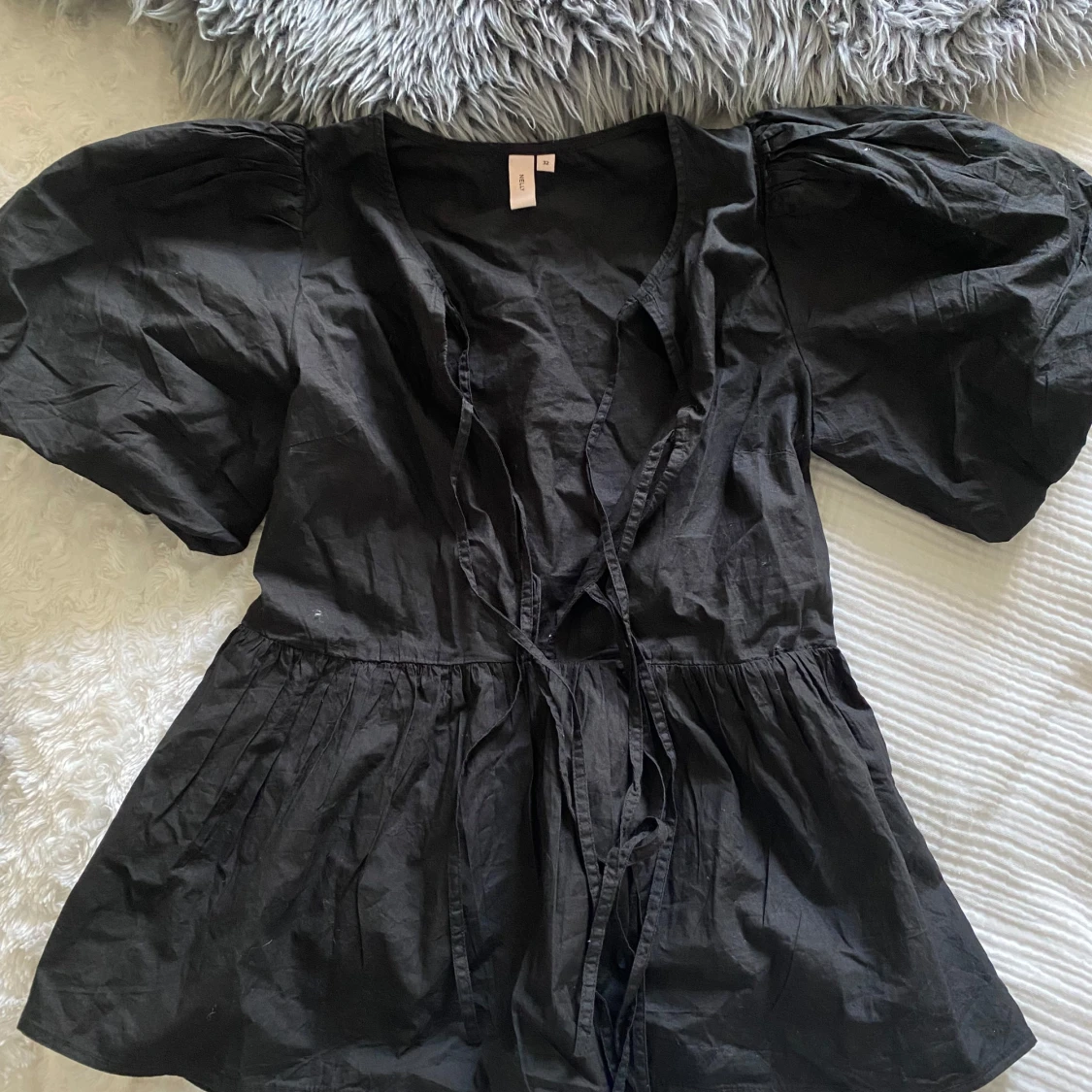 Supersnygg svart blus från Nelly med puffiga korta ärmar och knytband framtill. Blusen har en lätt v-ringning och markerad midja som ger en fin siluett. Perfekt för dig som gillar trendiga detaljer och en feminin look.