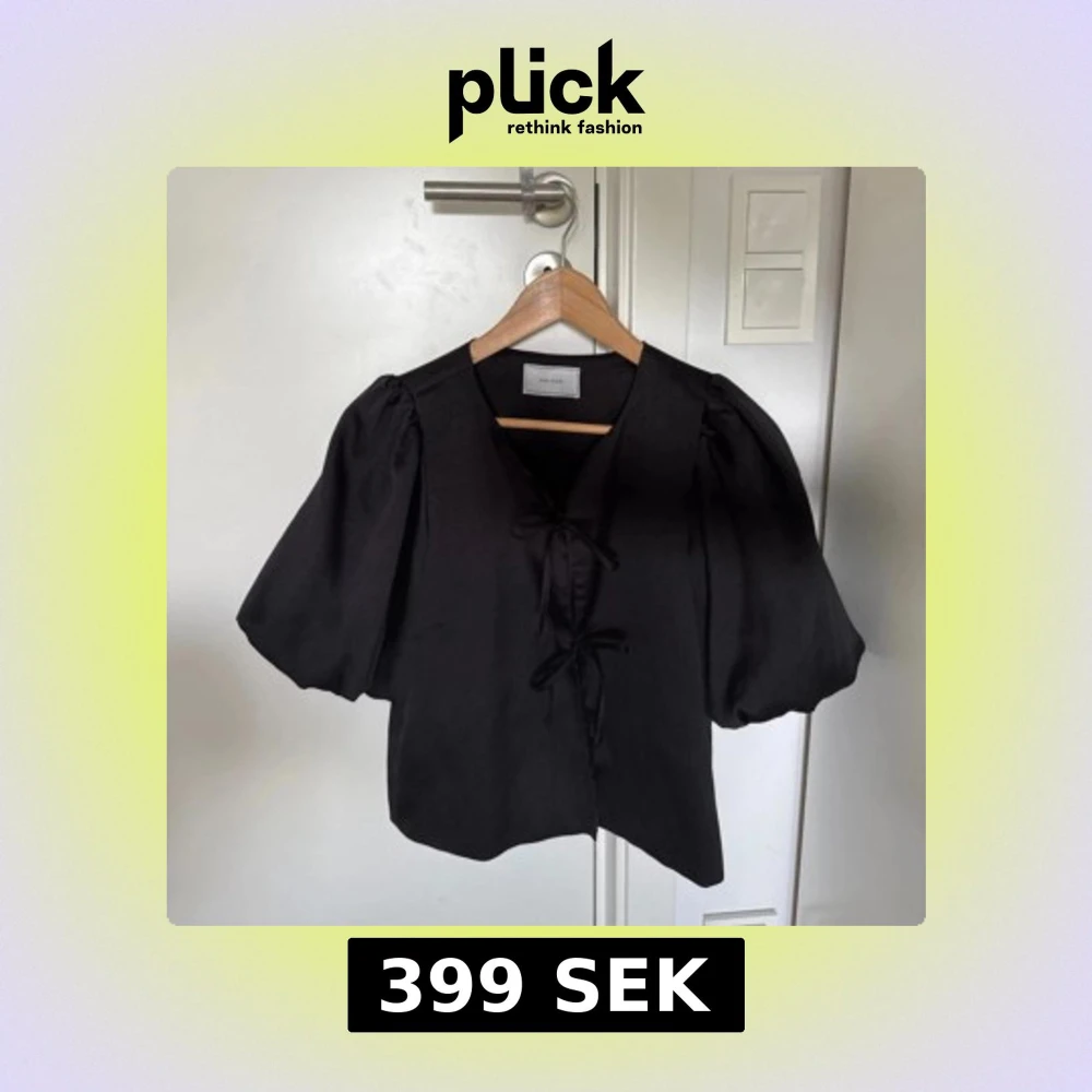 Supersnygg svart blus från Neo Noir med puffiga korta ärmar och knytning framtill. Blusen har en lätt glansig yta. Storlek 34 men passar även 36. Nypris 599 kr