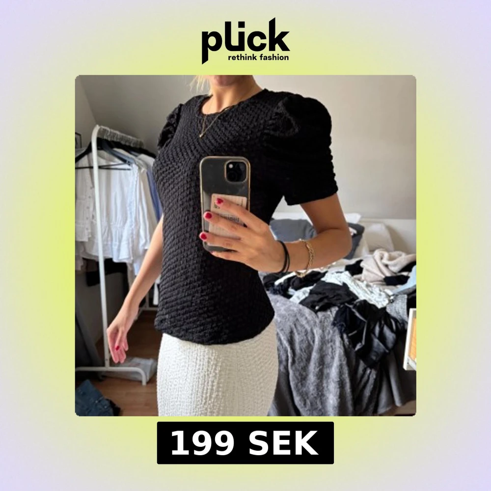 Säljer en svart blus med korta puffärmar och strukturerat tyg. Toppen har rund halsringning och en figurnära passform som ger en snygg siluett. Perfekt för dig som gillar stilrena och trendiga plagg med det lilla extra.