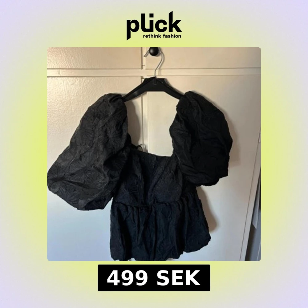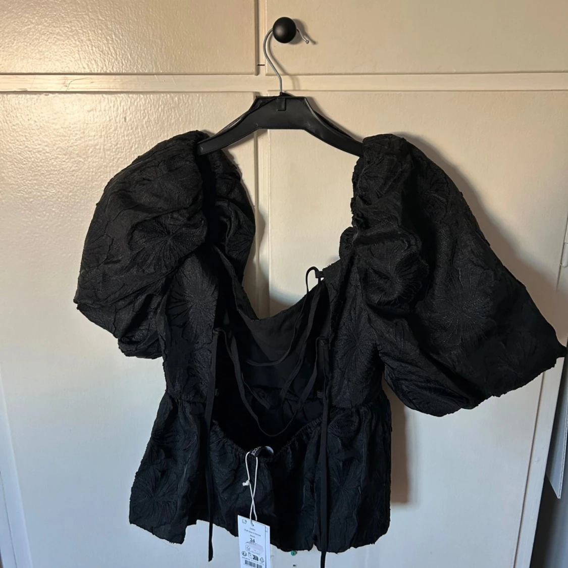 Säljer en svart blus med stora puffärmar och broderad textur. Öppen i ryggen med knytning. Den är endast använd 1 gång!